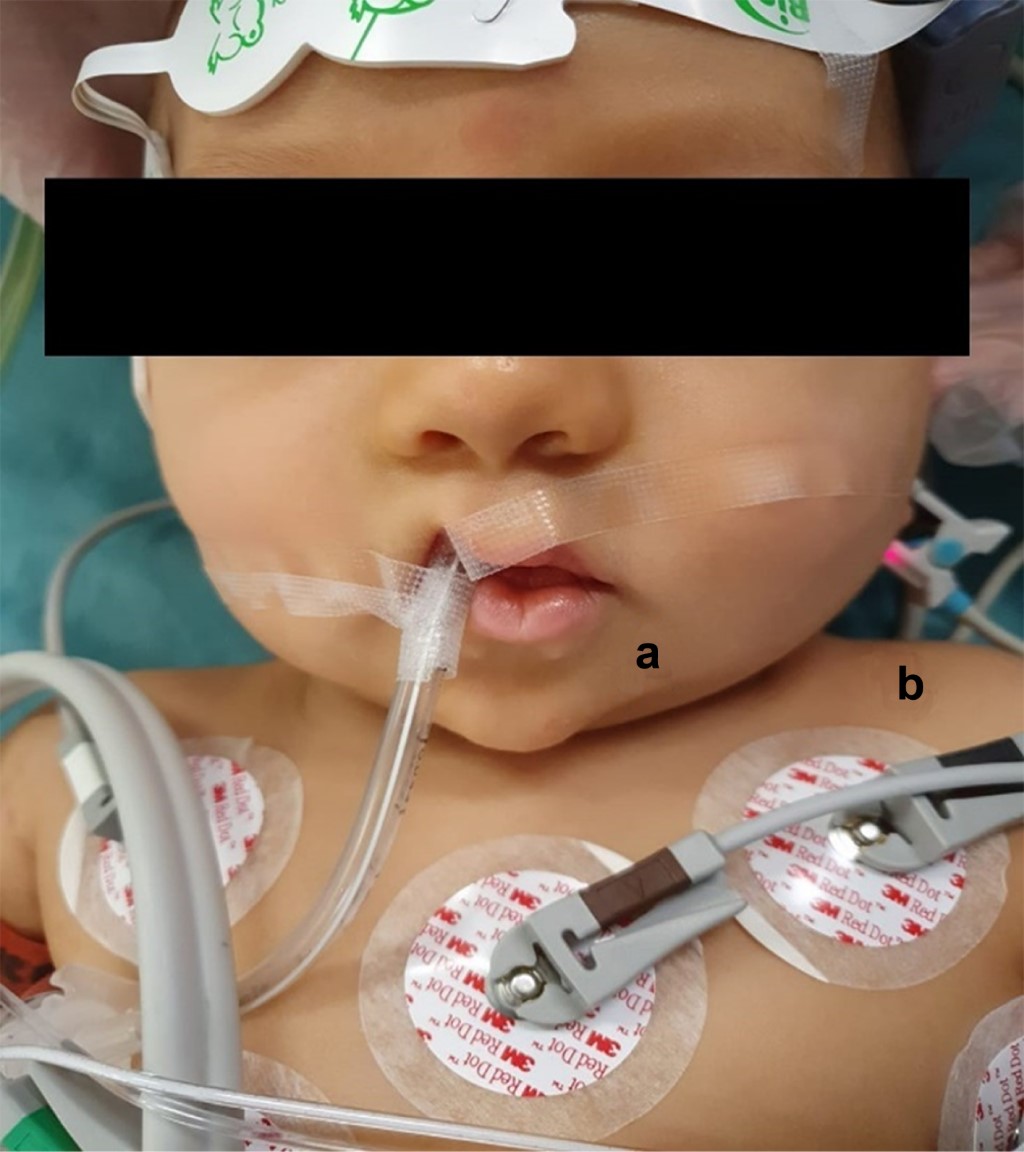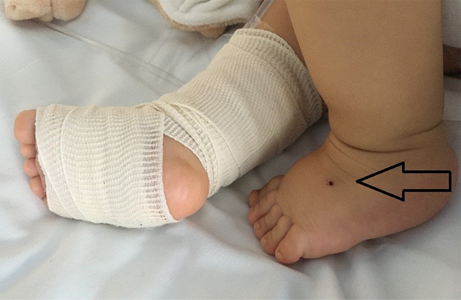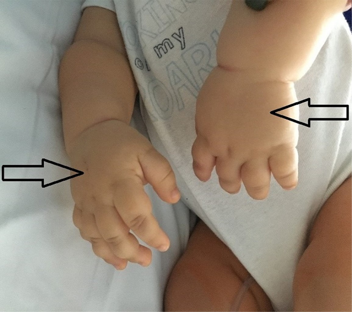 Al examen físico: talla 63 cm, peso 7.5 kg, frecuencia cardiaca (FC) 128 lpm, frecuencia respiratoria (FR) 24 rpm, presión arterial (PA) 85/60 mmHg, oximetría de pulso (SpO2) 96%, temperatura 36 oC. A la exploración de la vía aérea se observan: hipertelorismo, fisuras palpebrales descendentes, orejas de implantación baja, micrognatia, cuello corto y limitación moderada en la extensión (Figura 1). A la auscultación con ruidos cardiacos rítmicos sin soplos, los campos pulmonares bien ventilados sin fenómenos agregados. Extremidades superiores e inferiores con buen tono muscular y presencia de linfedema (Figuras 2 y 3).