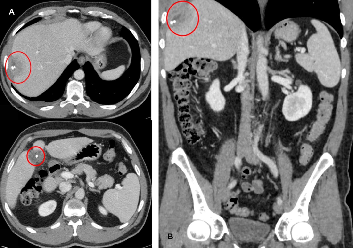 Se decide realizar pruebas complementarias de imagen, comenzando por una ecografía abdominal que evidencia una lesión heterogénea bien delimitada con calcificaciones en su interior ubicada en el lóbulo hepático derecho, lo cual plantea como primera opción diagnóstica la existencia de un absceso hepático (Figura 1). Ante la existencia de la lesión y la persistencia de la clínica, se decide ampliar el estudio mediante una TAC de urgencia para una mejor filiación de la misma. Se realiza una TAC abdominal con contraste intravenoso que pone de manifiesto la existencia de un discreto derrame pleural derecho, así como de una lesión de morfología ovalada con imágenes de densidad cálcica en su interior localizada en el espacio subfrénico derecho, y afectación hepática en el segmento VIII compatible con absceso o colección inflamatoria en dicho nivel. En el lecho quirúrgico de la colecistectomía se visualiza una imagen de predominio líquido, mal definida, que también presenta en su interior la presencia de litiasis (Figura 2).