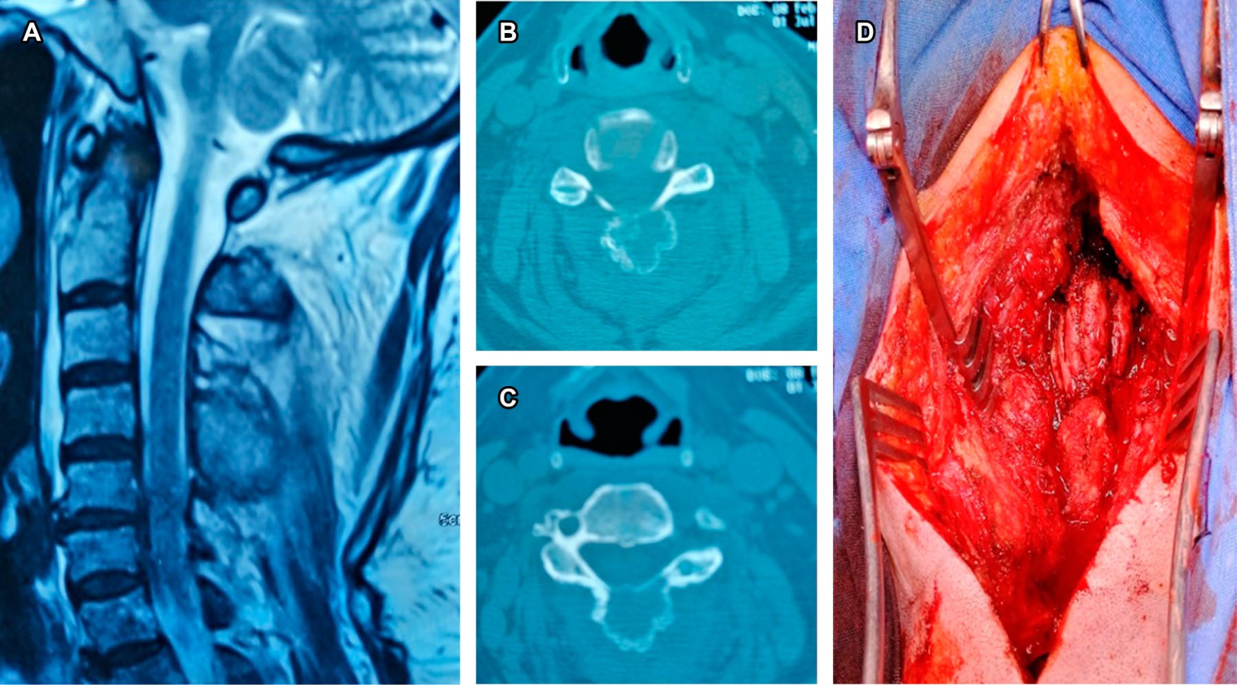 Femenino de 35 años de edad, ama de casa sin antecedentes de importancia, con padecimiento de tres semanas de evolución caracterizado por dolor cervical incapacitante, progresivo, que le impide conciliar el sueño. A la exploración: contractura de músculos de nuca, incapacidad para la flexión y extensión del cuello; exploración neurológica normal, fuerza muscular, sensibilidad y reflejos en las cuatro extremidades normales. Se practica resonancia magnética (Figura 1A) y tomografía de la columna cervical (Figura 1B-C), se encuentra masa tumoral que afecta la lámina de la cuarta vértebra cervical. Se intervino quirúrgicamente por laminectomía practicando la resección de la totalidad de la lesión (Figura 1D), el reporte histopatológico fue de osteoblastoma.