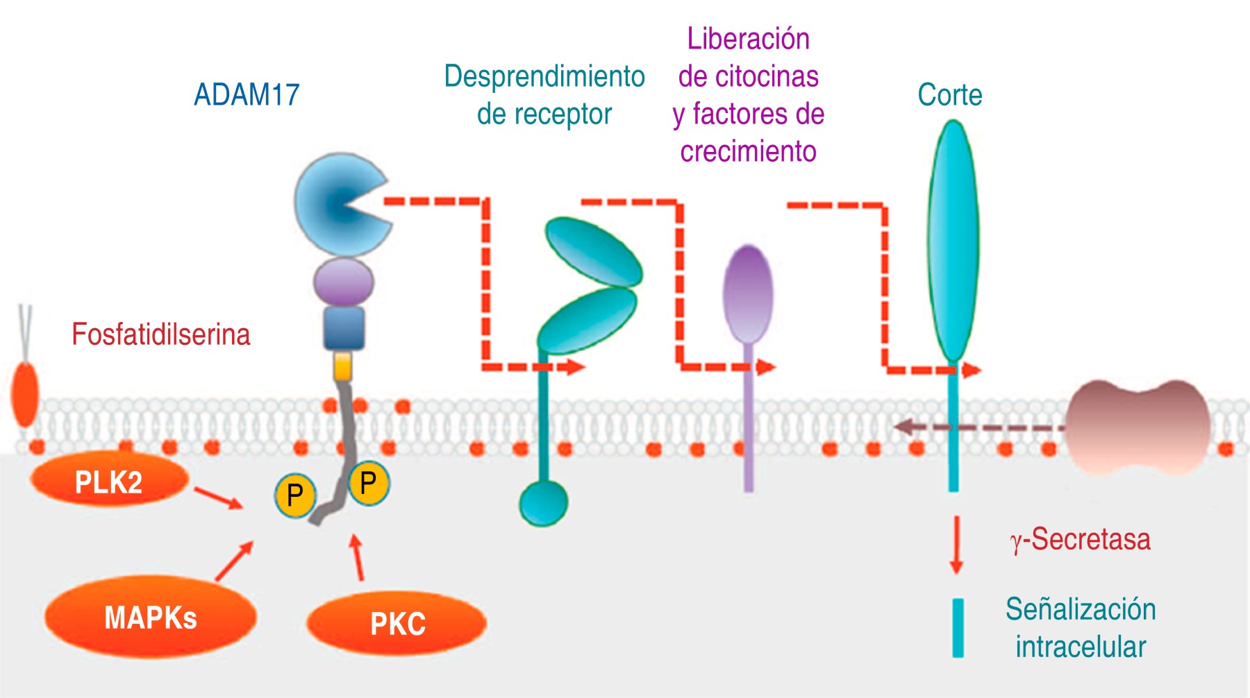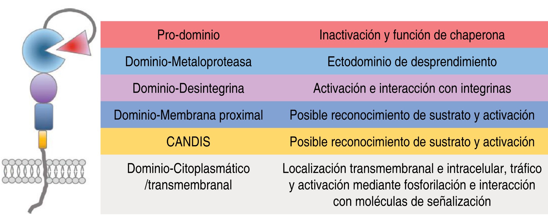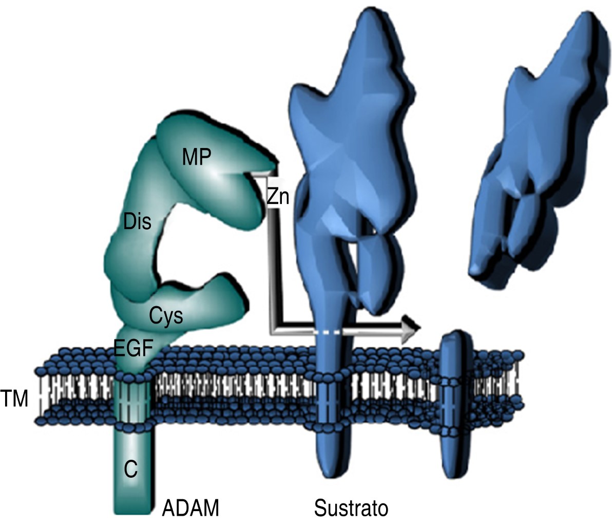 Cerca de 10% de las proteínas de superficie celular se considera que pueden ser proteolíticamente cortadas, generando proteínas solubles. En relación a este mecanismo ADAM17 fue la primera proteasa caracterizada y se demostró que está formada por una secuencia con el extremo N-terminal, seguida de un pro-dominio, una metaloproteinasa o dominio catalítico, un dominio de desintegrina, un dominio proximal membranal rico en cisteína, un solo dominio transmembranal y una porción citoplásmica (Figura 2).15,16