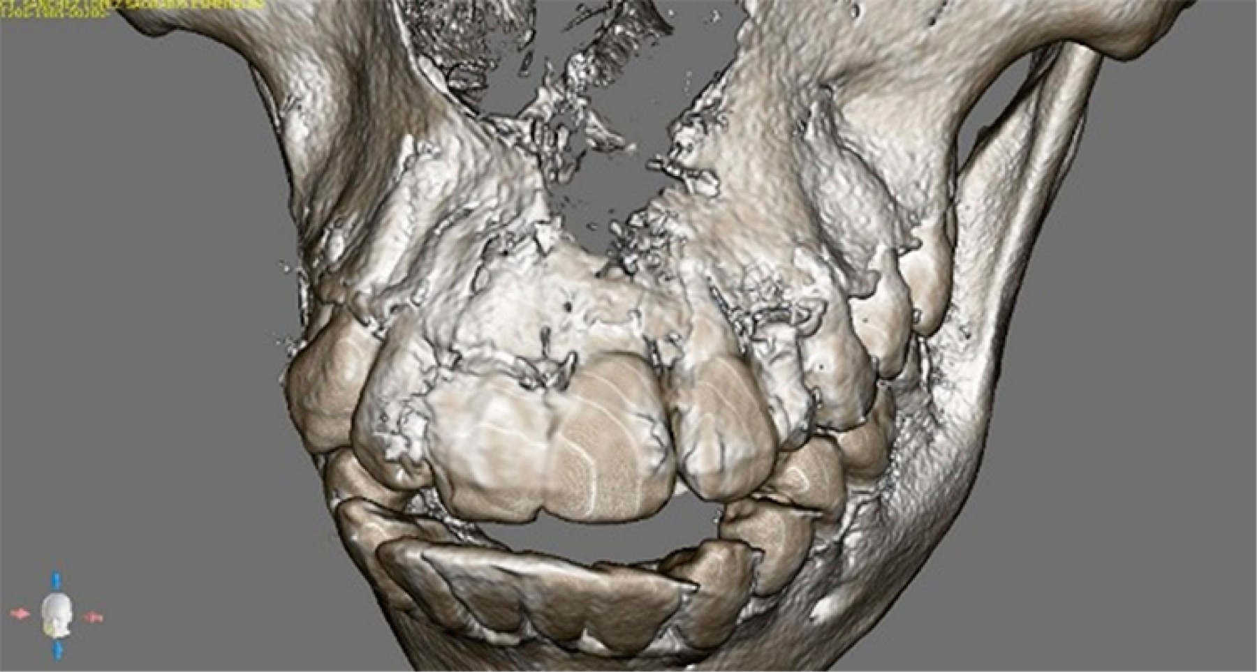 Paciente femenino de 34 años de edad, se presentó a la Clínica de Odontología de la Universidad Nacional Autónoma de Honduras con el deseo de mejorar su sonrisa estéticamente colocándose un implante dental, debido a que presentaba un órgano dentario 6,3 en el lugar donde debe estar situado el 2,3; dicha situación comprometía estéticamente la sonrisa de la paciente afectando su autoestima y satisfacción propia con respecto a su apariencia física. La paciente contaba con su radiografía panorámica inicial, en ella se observó la presencia de un órgano dental incluido (2,3) en una posición horizontal en el proceso alveolar ubicado apicalmente a los órganos dentales 2,1, 2,2, 6,3 y 2,4 causando reabsorción radicular en ellos, se observaron también restauraciones mal adaptadas en la pared palatina de los órganos dentales 1,1 y 2,1 junto con lesiones periapicales. En la evaluación clínica se observa el órgano dentario deciduo con movilidad dental debido a reabsorción radicular y caries en esmalte y dentina (Figura 1).