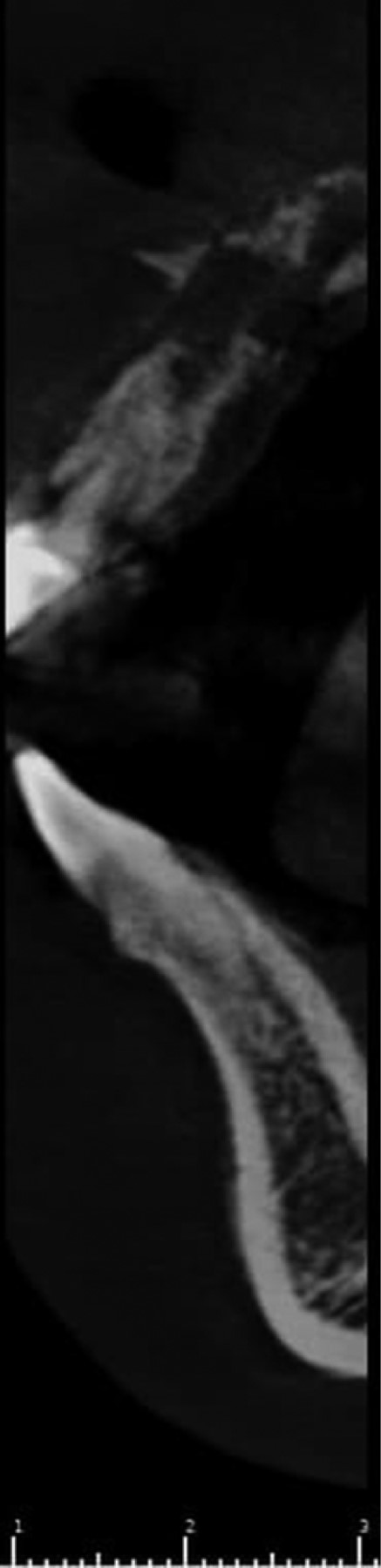 En la valoración de la tomografía se observó una zona hipodensa a nivel del periápice del órgano dentario 2,1 extendiéndose hacia vestibular (Figura 3).