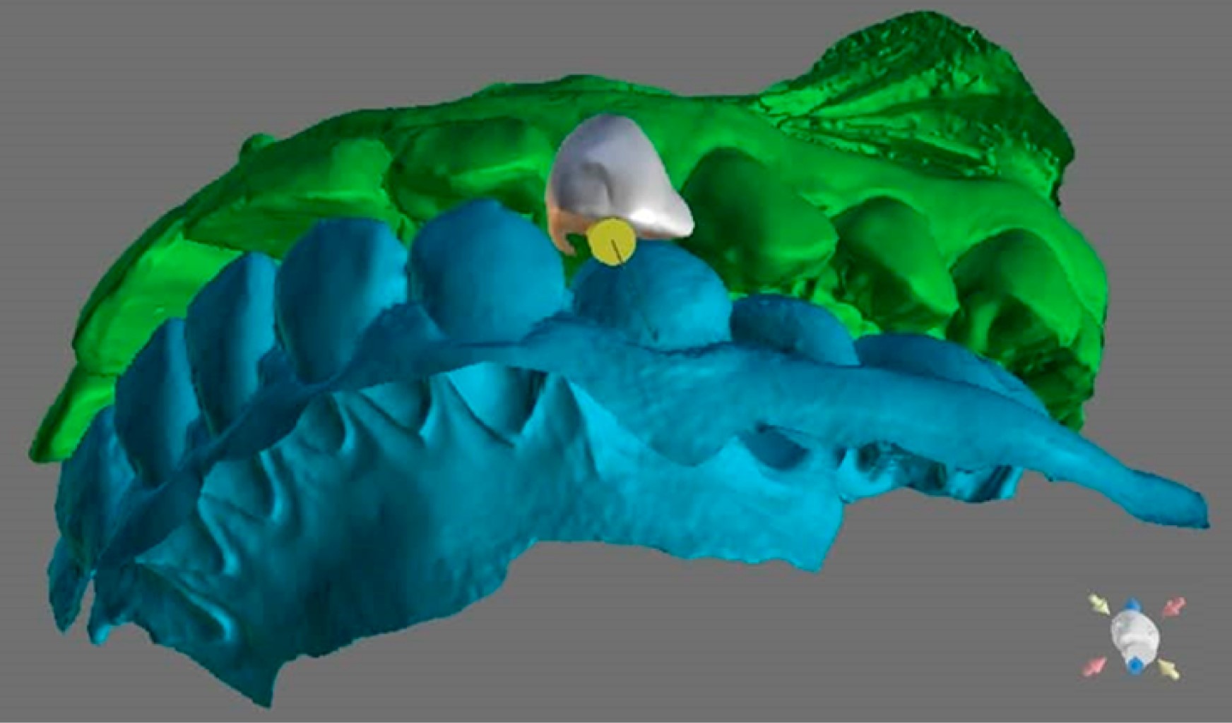 Se planificó la enucleación del quiste periapical junto con la colocación del xenoinjerto de hueso bovino de 0.25 cm3 debido a la reabsorción ósea que el quiste había provocado; posterior a esto, se procedería a colocar el implante dental. Se realizó una recreación digital de la corona del órgano dentario 2,3 con el programa BlueSkyBio para lograr una mejor planeación digital que serviría para la elaboración de una guía quirúrgica impresa en 3D que facilitaría el procedimiento de la colocación del implante dental (Figuras 4 y 5).