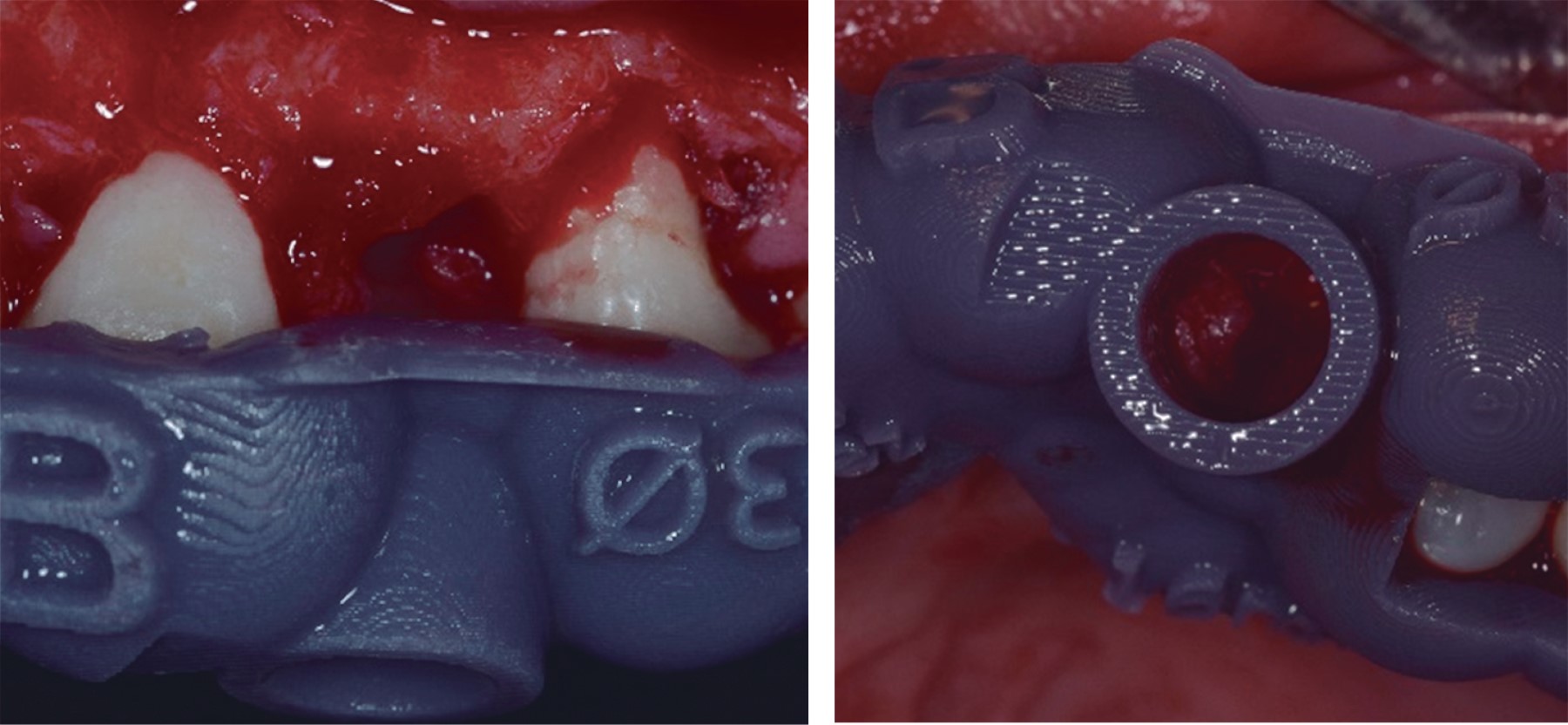 Se procedió a realizar la exodoncia del órgano dental deciduo y luego se ubicó la guía quirúrgica, ésta se utilizó como referencia para la colocación del implante dental en la zona donde estaría situado el órgano dental 2,3 (Figuras 6, 7 y 8).