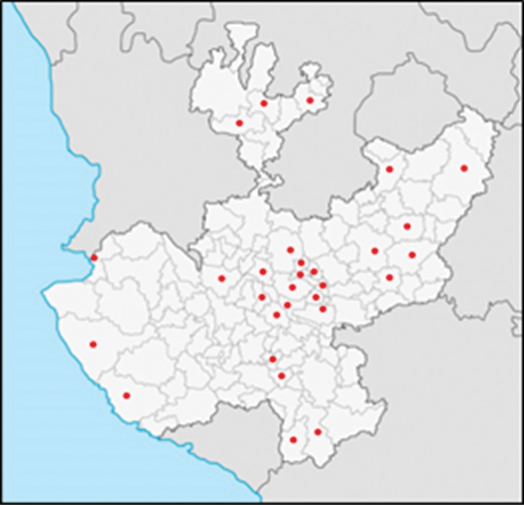 Análisis geográfico. La distribución geográfica de los pacientes con LPH en el estado de Jalisco fue principalmente en las zonas urbanas de la zona metropolitana de Guadalajara, el municipio de Guadalajara tuvo el mayor porcentaje de casos. Asimismo, los municipios que tuvieron menor número de pacientes estuvieron distribuidos en el sur, norte, noroeste y centro del estado. Entre los municipios con mayor número de casos en este estudio fueron Guadalajara, Zapopan, Tonalá, Tlaquepaque y Tlajomulco, municipios que conforman la zona metropolitana de Guadalajara (Figura 1).
