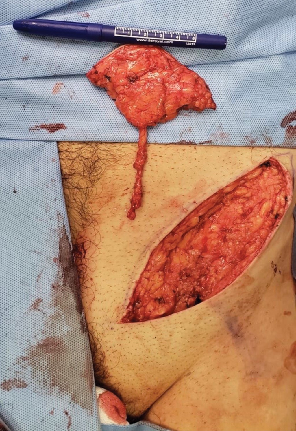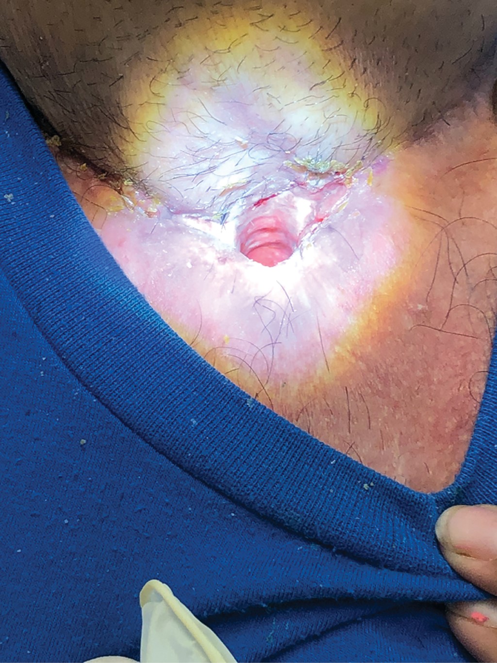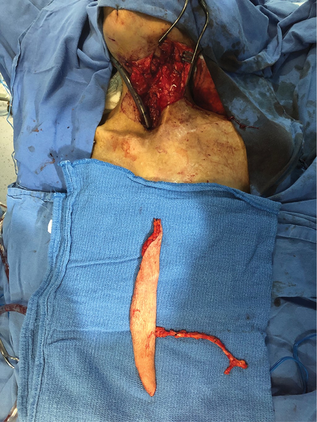 Hombre de 45 años, con carcinoma recurrente con invasión a hipofaringe. Se realizó faringolaringectomía radical con resección amplia de piel de cuello, reconstrucción con dos colgajos anterolateral de muslo (ALT): uno anastomosado a vasos faciales derechos para reconstrucción de faringe, suturado en forma tubular y anastomosado a la porción superior del colgajo a orofaringe y la porción distal se anastomosó al esófago proximal. Asimismo, el otro colgajo se utilizó para cobertura externa y se anastomosó a vasos faciales izquierdos. La evolución fue satisfactoria retirando la sonda nasogástrica a las tres semanas de la cirugía. Toleró la dieta de líquidos y sólidos y acudió nuevamente tres meses después de la cirugía inicial, con salida de saliva y líquidos por fístula hipofaringeocutánea a nivel de la unión del colgajo ALT y el estoma traqueal en su parte anterior. Se observó orificio de 2 cm de diámetro con salida abundante de saliva y se optó por un colgajo perforante de la arteria circunfleja superficial (SCIP) por ser un colgajo muy delgado, el cual se anastomosó término-lateral a la arteria carótida interna y vena yugular interna. La isla cutánea se suturó a todo el defecto circular, resaltando que en la porción inferior se unió a la porción posterior del estoma traqueal. Se utilizó la parte de la piel para cobertura interna y se colocó injerto de espesor parcial en la parte externa que corresponde al orificio traqueal (Figuras 1, 2 y 3). La evolución fue satisfactoria, tolerando dieta sólida a los seis meses de seguimiento.