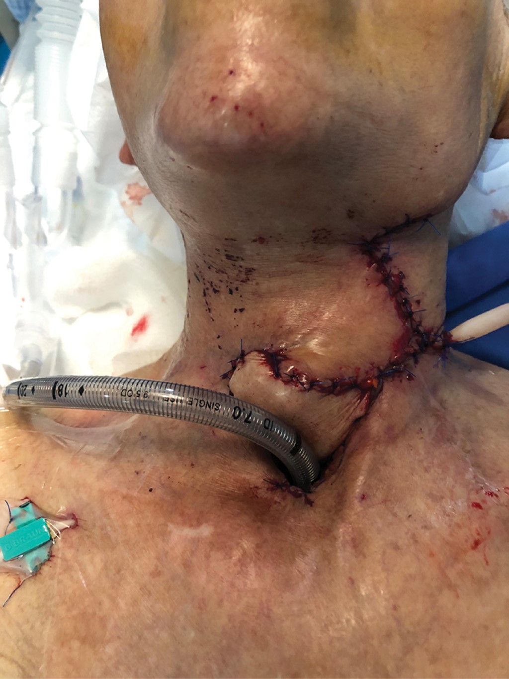 En el caso 2 se optó por un colgajo ALT, ya que la paciente era en extremo delgada, por lo que el ALT con doble isla cutánea logró cubrir tanto en forma interna como externa sin provocar obstrucción del estoma traqueal.