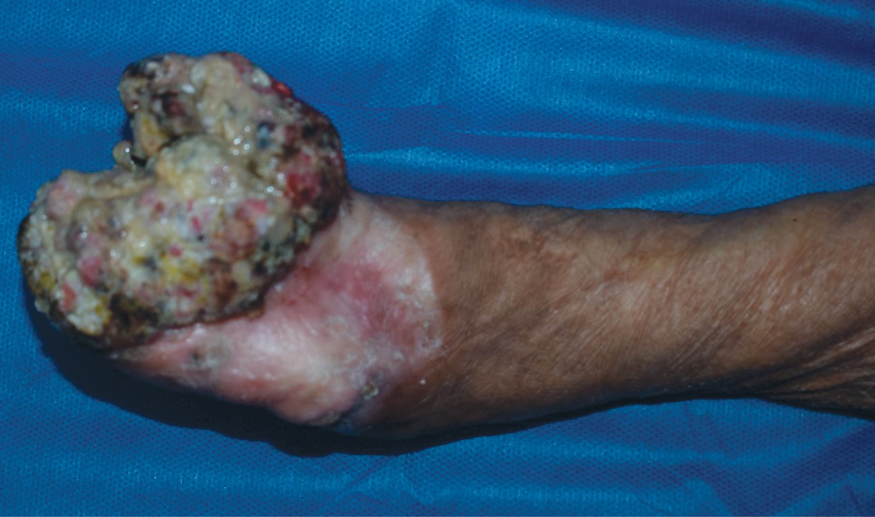 Se le llama úlcera de Marjolin a la lesión caracterizada por heridas crónicas asociadas principalmente a quemaduras, úlceras venosas, úlceras por presión y otras heridas que desarrollan algún tipo de cáncer; suelen ser de evolución lenta, con un tiempo promedio de 25 años.1 En una revisión sistemática realizada en 2018 sobre los casos publicados, Abdi y colegas,2 reportaron 599 casos de úlceras de Marjolin, donde el 82% de los pacientes pertenecían a países de ingresos bajos y medios, el 65% de las úlceras fueron precedidas por quemaduras, los tratamiento más usados fueron resección quirúrgica (71%), amputación (21%), radioterapia (2%) y quimioterapia (1%). El tratamiento con quimioterapia y radioterapia se reserva para paciente que tienen una contraindicación quirúrgica, o como tratamiento coadyuvante en tumores con resección incompleta, metástasis ganglionares o recidivas tumorales.3