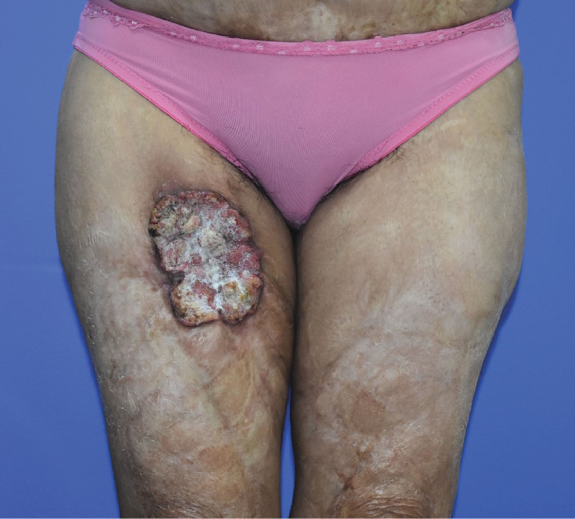A la exploración física se observó dermatosis en mano izquierda, de la que afectaba la porción distal, constituida por una neoformación de aspecto exofítico de 8 × 5 × 5 cm, color café rojizo, alternando con zonas de color café claro, natas purulentas con áreas de necrosis, de bordes irregulares bien definidos, con olor fétido, no dolorosa a la palpación (Figura 1). Al resto de la exploración física, presentaba adenomegalias palpables en axila. En la extremidad inferior derecha se observaba dermatosis que afectaba la cara anterior del muslo a nivel del tercio proximal, con medidas de 7.3 × 0.8 × 11.0 cm, constituida por una úlcera con aparente tejido de granulación en su superficie, zonas de tejido blanco amarillento de aspecto vegetante, con bordes elevados, hiperpigmentada en la periferia y asentada sobre la cicatriz atrófica, con zonas hipopigmentadas, sugestiva de evolución crónica (Figura 2). No presentaba adenomegalias palpables en la región inguinal y poplítea. Se realizó una tomografía que evidenció adenopatías en región axilar derecha; la más representativa con medidas de 1.6 × 1.2 cm y en región inguinal superficial derecha, con medidas de 1.4 × 1.5 × 2.0 cm, sin evidencia de enfermedad a distancia.