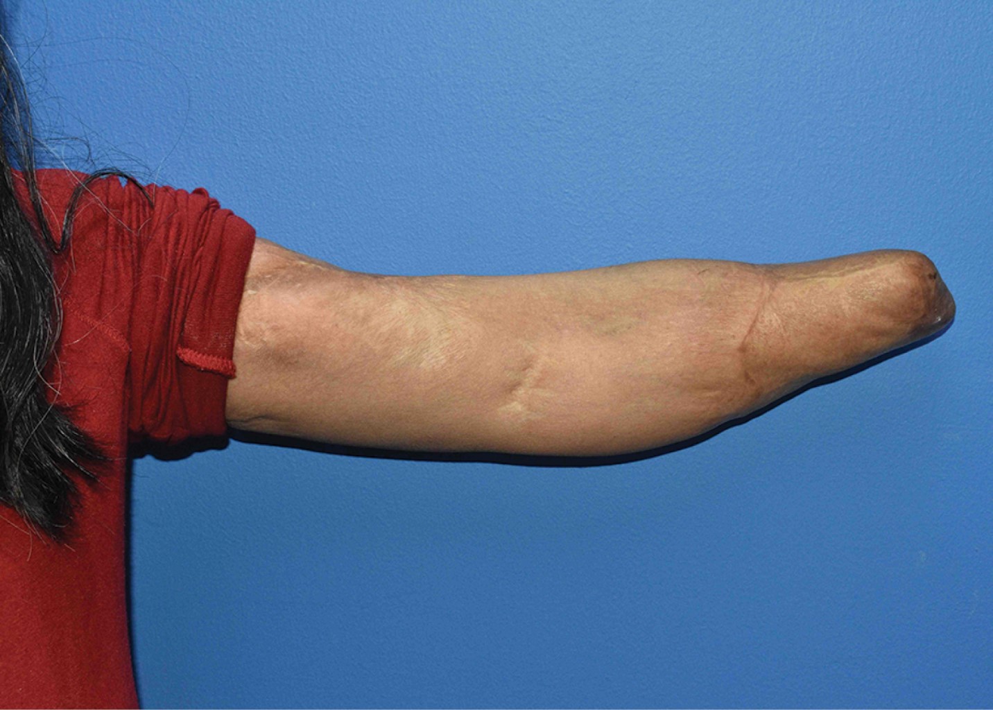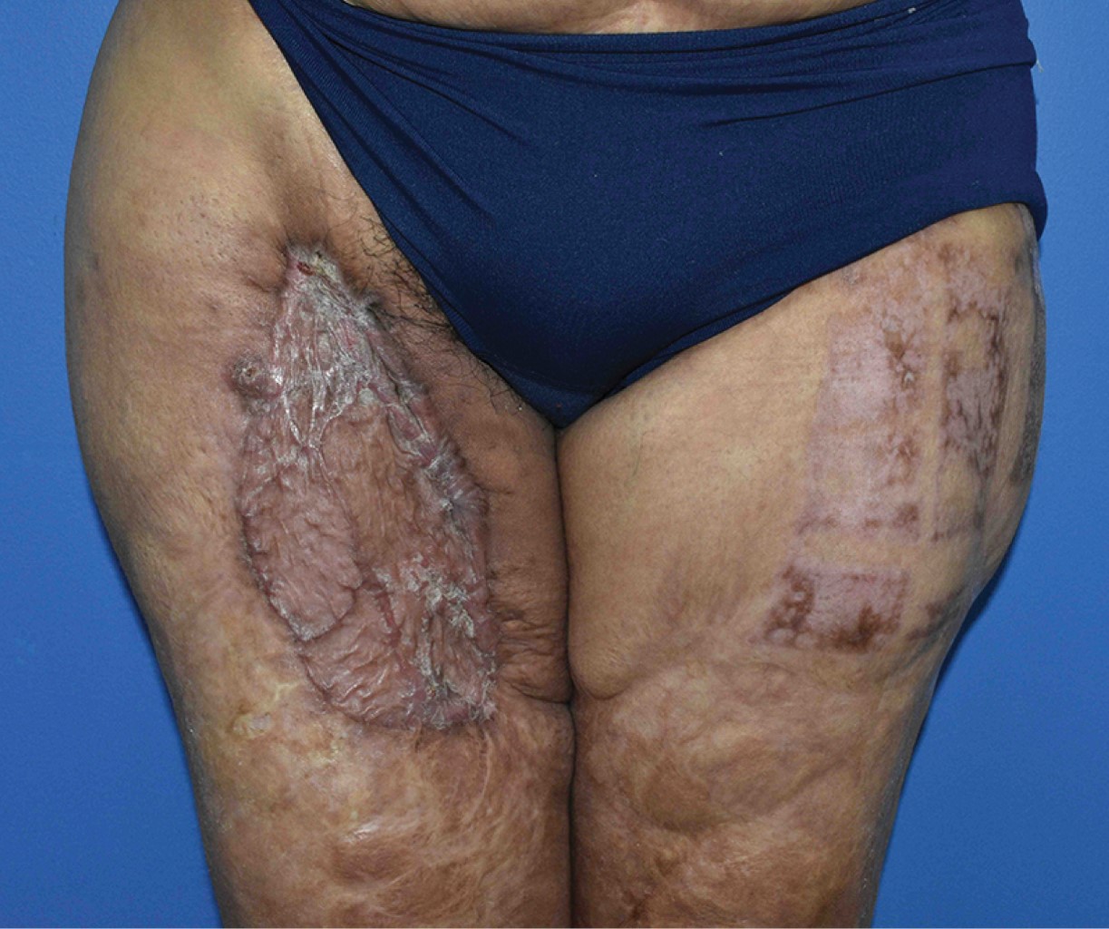 La paciente fue referida a radiooncología para valorar radioterapia al egreso y cita de seguimiento en cirugía plástica para seguimiento, a las cuales no acudió. Se contactó con la paciente y acudió a los cuatro meses, refiriendo no haber podido acudir a radioterapia y consultas de seguimiento por motivos económicos. A la exploración física, la herida de extremidad superior estaba bien cicatrizada, (Figura 3) en muslo el injerto de piel integrado, sin datos de infección, con adenopatías axilares palpables y región inguinal sin adenopatías (Figura 4). Se refirió a radiooncología médica nuevamente y se citó en seis meses para revaloración.
