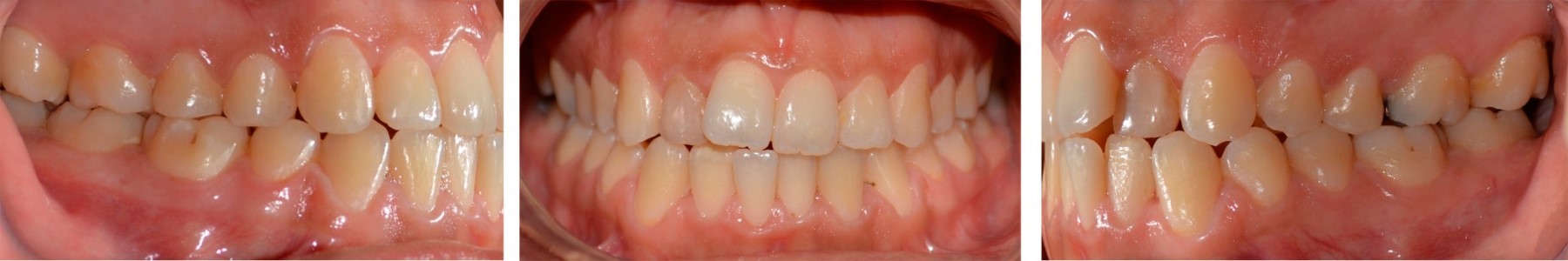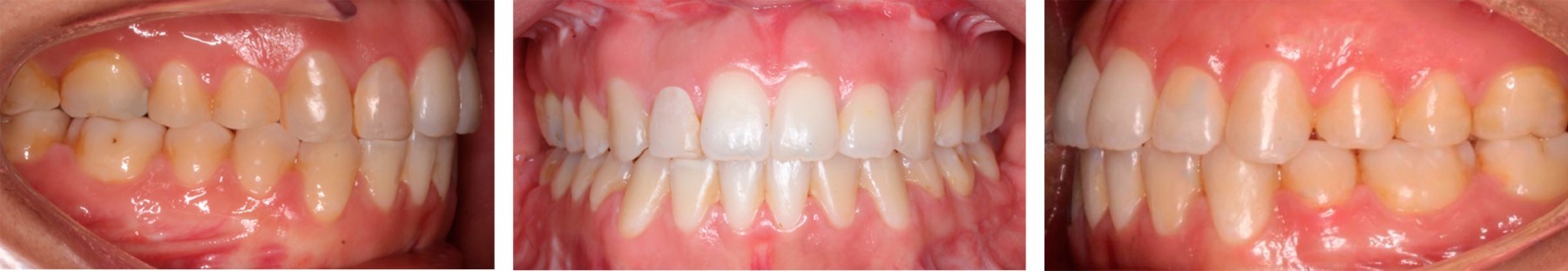 La duración del tratamiento fue de 32 meses, se alcanzó la coordinación de ambas arcadas, se corrigió el exceso de crecimiento vertical de la paciente, se consiguió clase I canina bilateral, sonrisa con arco positivo, correcta guía anterior (overjet y overbite), coincidencia de las líneas medias, se eliminó la mordida borde a borde en sector anterior y la mordida cruzada en sector posterior derecho (Figuras 5 y 6). En el examen radiográfico se observó paralelismo radicular y las adecuadas inclinaciones de los incisivos (Figuras 7 y 8, Tabla 2).