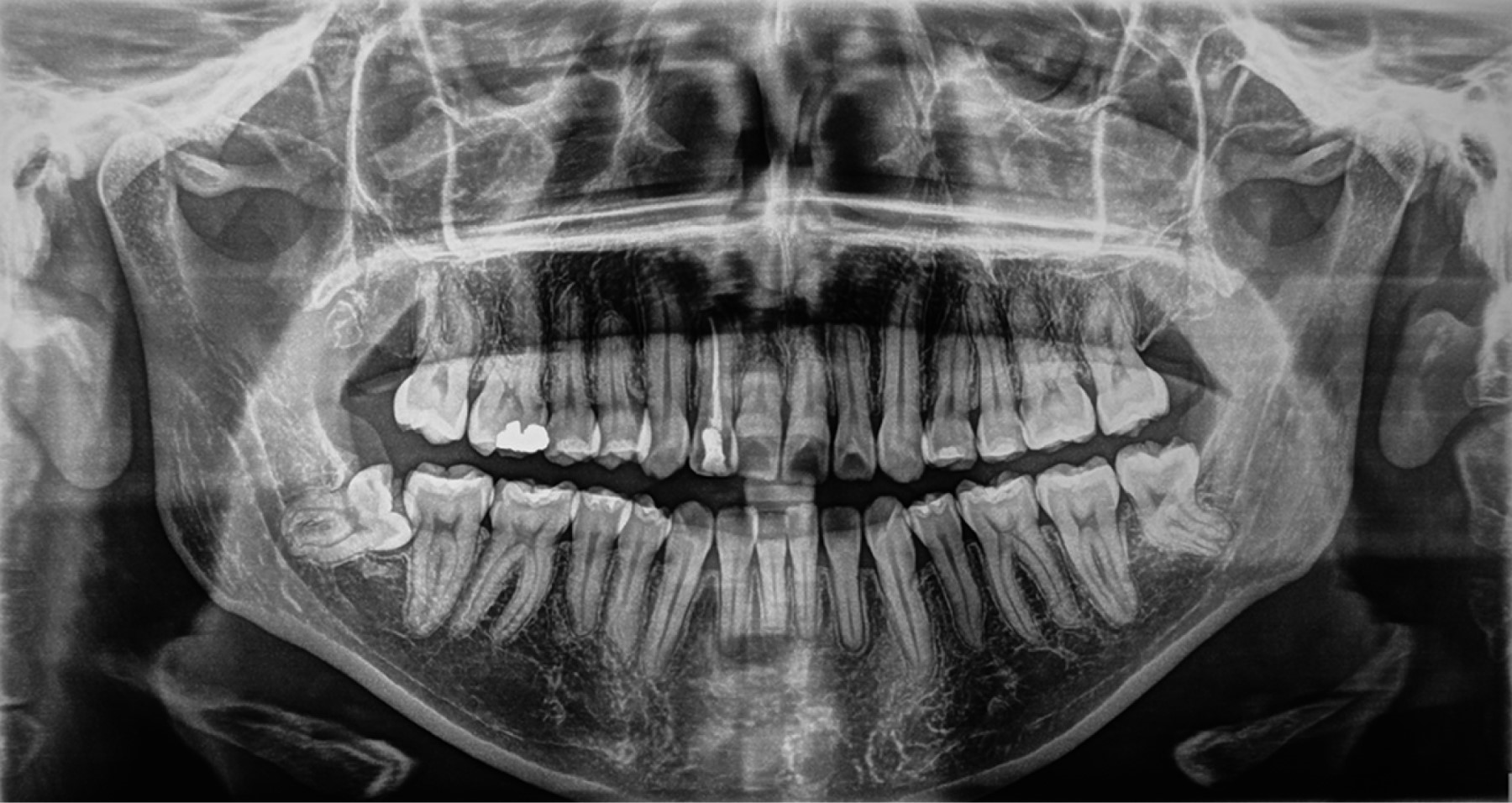 Paciente femenino de 21 años que se presenta en el Centro de Alta Especialidad "Dr. Rafael Lucio", cuyo motivo de consulta es "quiero cerrar la boca bien", no refiere alergias ni malos hábitos. Presenta un biotipo dolicofacial, cara ovalada, línea media facial no coincide con la línea media dental superior, sonrisa gingival de 8 mm y exposición de incisivo en reposo de 6 mm, con un perfil recto, deficiencia del tercio medio facial (Figura 1), mordida borde a borde en el sector anterior, mordida cruzada unilateral derecha posterior, un overjet de 0 mm, clase I canina bilateral, clase I molar derecha y III izquierda por la ausencia del OD 35, apiñamiento leve superior e inferior (Figura 2).