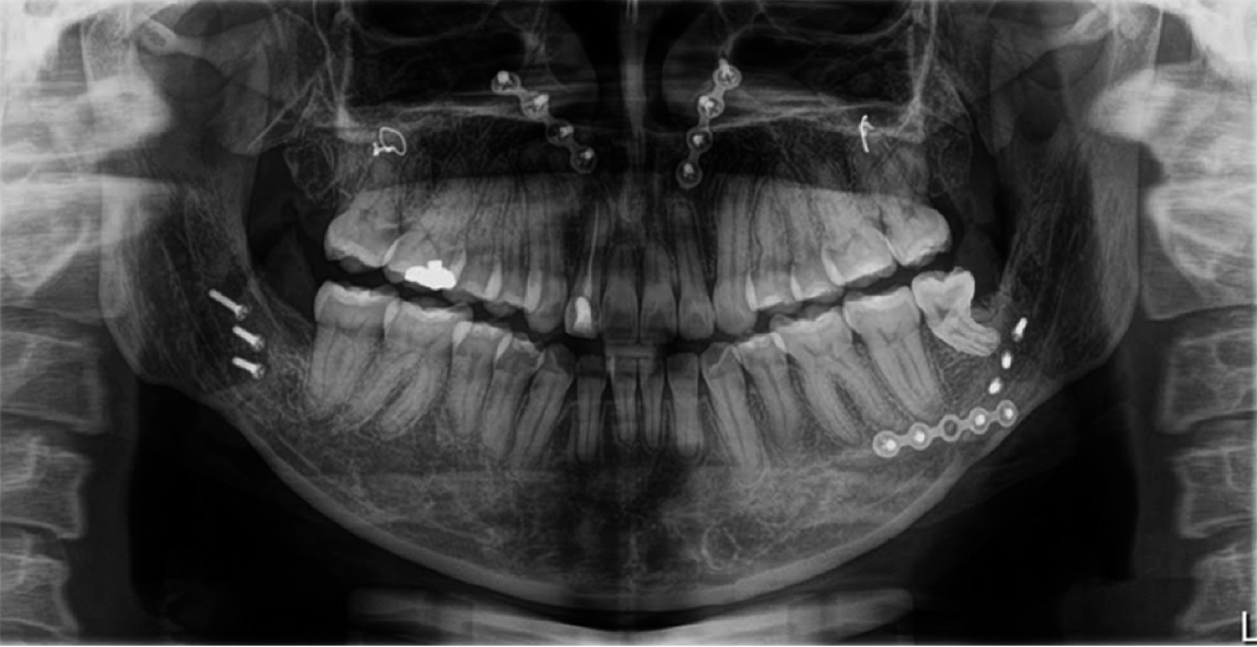 Fase quirúrgica: se determinó realizar cirugía bimaxilar, en el maxilar superior se realizó una osteotomía Le Fort tipo 1 alta por la hipoplasia del tercio medio que presentaba el paciente, se realizó un avance maxilar de 4 mm y una intrusión maxilar de 6 mm en anterior y 5 mm en posterior. En la mandíbula se realizó una OSRAM (osteotomía sagital de rama), con anterorrotación mandibular. La segunda fase constó de tres semanas, desde la cirugía hasta la primera cita postquirúrgica, previa recuperación.