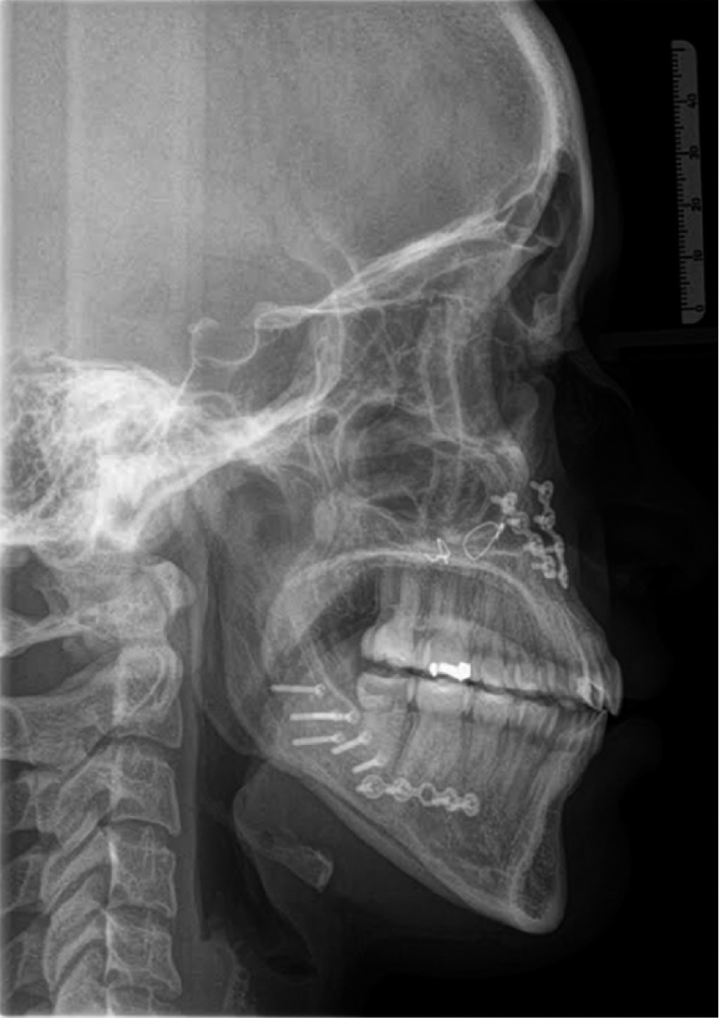 Al cabo de 18 meses se revaloró el caso con estudios radiográficos y modelos de estudio junto con el Departamento de Cirugía Oral y Maxilofacial y se programó la cirugía ortognática. Se colocaron arcos quirúrgicos previos a la cirugía, arco 0.019" × 0.025" de acero inoxidable con ganchos quirúrgicos. La primera fase del tratamiento constó de 20 meses.