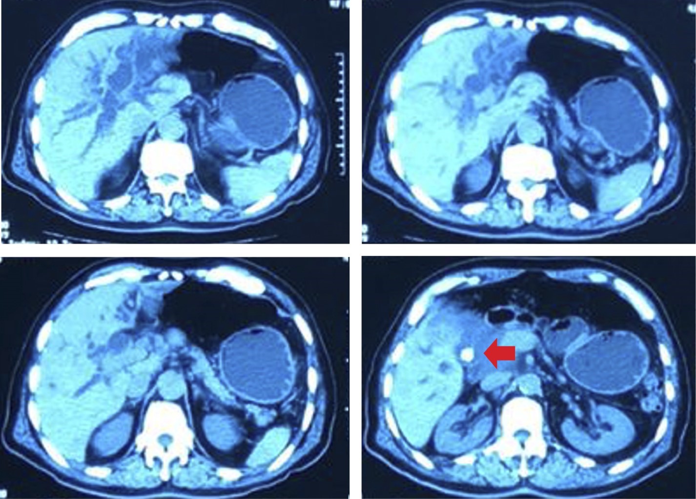 Se realiza tomografía computarizada axial contrastada de abdomen encontrando importante dilatación de la vía biliar intra y extrahepática con colédoco de 19 mm, litiasis vesicular, así como engrosamiento de la porción intramural del colédoco distal, sin observar defectos de llenado. El páncreas se aprecia de contornos regulares sin colecciones ni modificación de la grasa peripancreática. Cabe mencionar la presencia de adenomegalias del segmento retroduodenal no mayores a 8 mm (Figura 1).