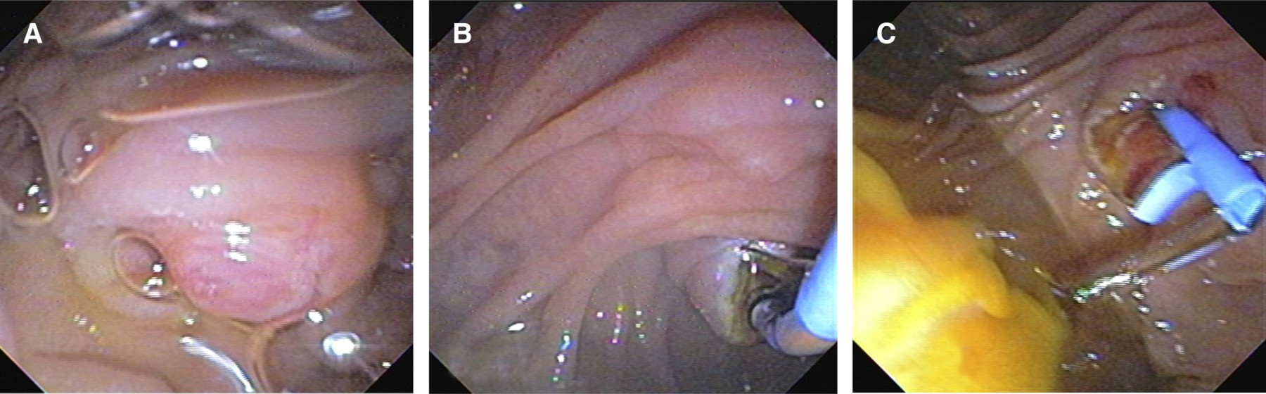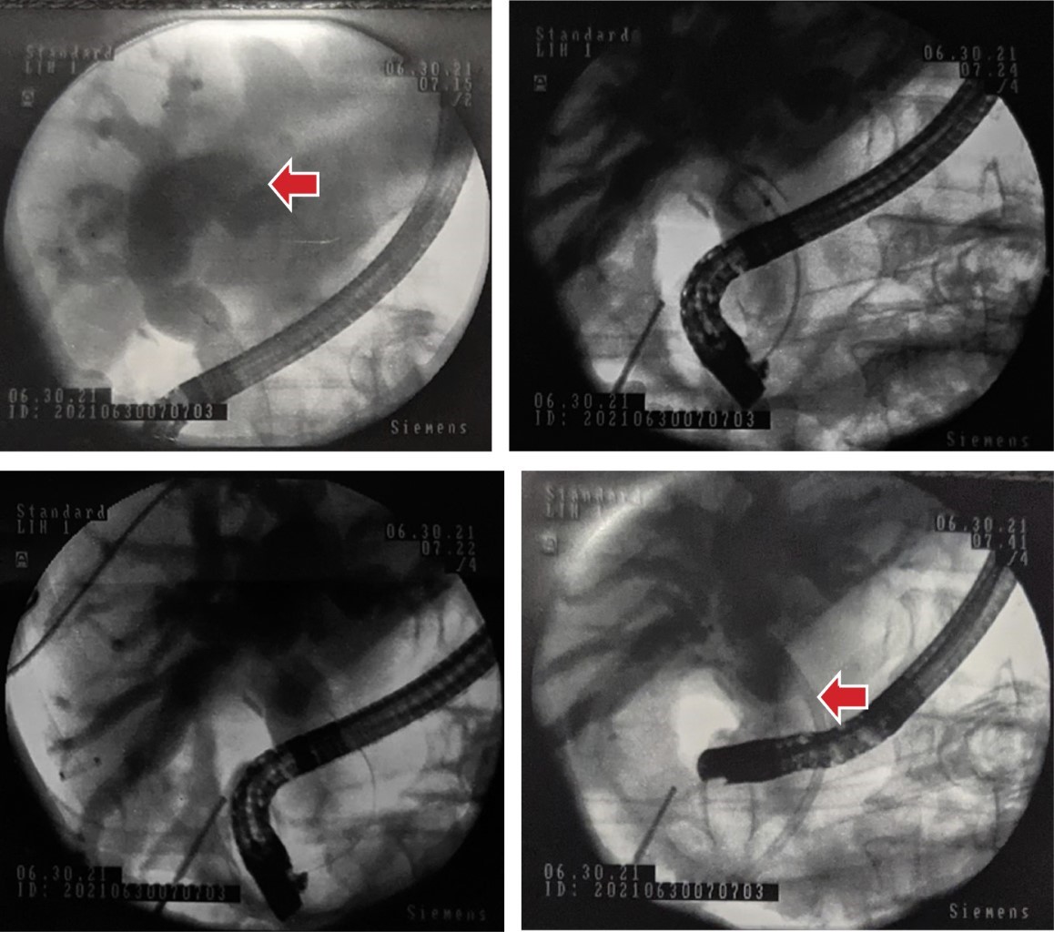 Durante el procedimiento quirúrgico se encuentra vesícula edematosa aumentada de tamaño con contenido purulento, pared engrosada de hasta 8 mm y segmentos de necrosis en su superficie, se observa dilatación del conducto cístico hasta 25 mm (Figura 2). Se procede a introducir duodenoscopio de visión lateral en tiempo transoperatorio hasta la segunda porción del duodeno, observando papila hipertrófica con ausencia de salida de bilis, se canula esfínter de Oddi en el primer intento y se opacifica de manera selectiva la vía biliar con medio de contraste observando dilatación importante de la vía intra y extrahepática, con colédoco tortuoso que llega a medir hasta 25 mm, por debajo de la unión de los conductos hepáticos derecho e izquierdo. En la unión del conducto cístico se observa una estenosis concéntrica de consistencia dura franqueable con la guía (Figura 3). Se realizan tres barridos con balón extractor obteniendo sólo detritus biliares con hemorragia al paso por el sitio de la estenosis. Se realiza cepillado biliar para ser procesado por patología y esfinterotomía de 20 mm, se decide colocar prótesis biliar Cotton-Leung® de 10 × 10 Fr y se retira la vesícula biliar (Figura 4).