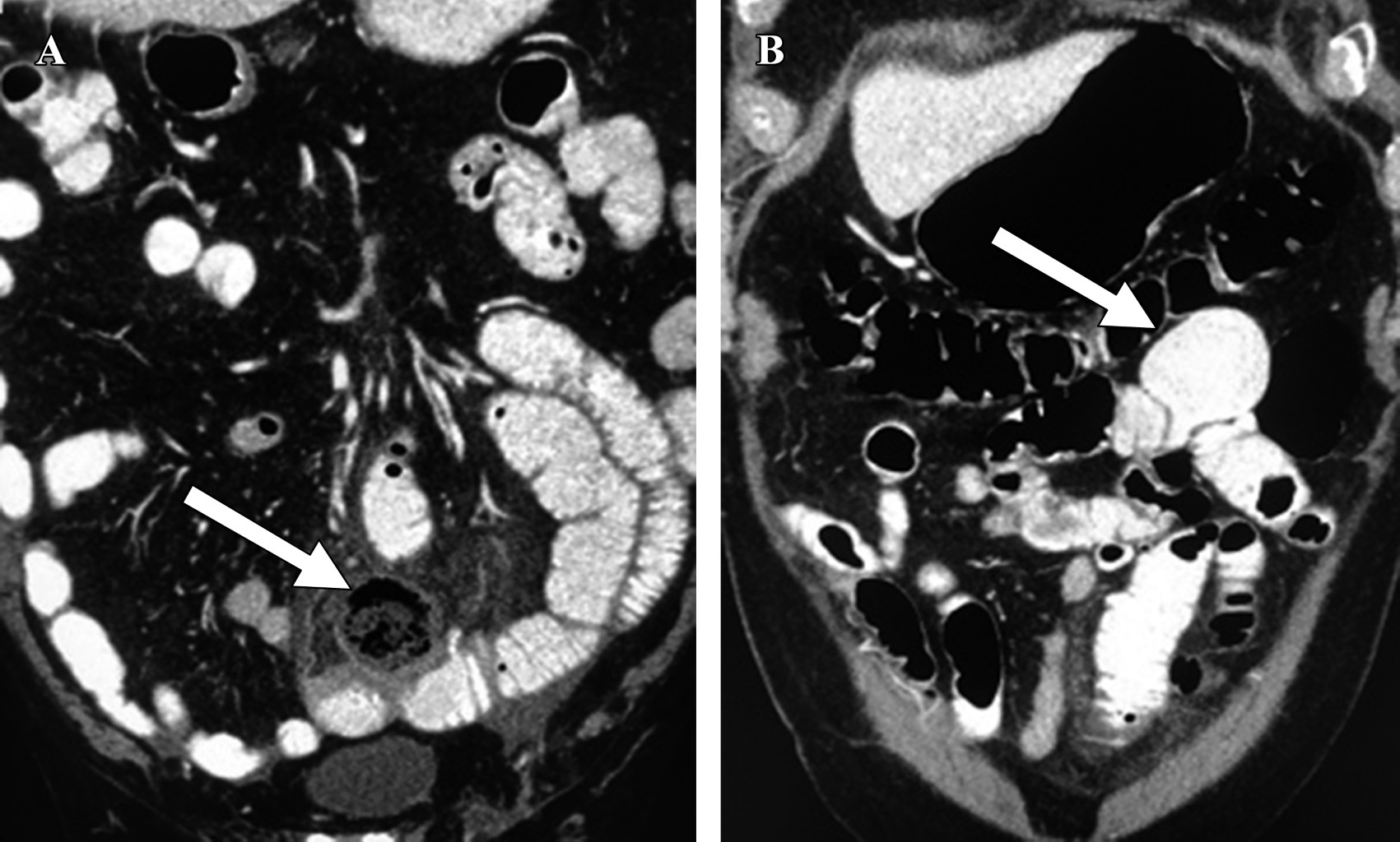 Paciente masculino de 80 años con mal estado general, dolor abdominal de 48 horas de evolución, fiebre, leucocitosis e irritación peritoneal localizada hacia la fosa iliaca izquierda. Antecedentes de dolor abdominal crónico y diarrea atribuidos a síndrome de intestino irritable y diverticulosis sigmoidea. Diagnosticado inicialmente con un cuadro de probable enfermedad diverticular complicada del colon, por lo cual se le solicitó tomografía abdominal contrastada. En dicho estudio, se reportó la presencia de un plastrón inflamatorio asociado a un segmento de intestino delgado en la zona del hipogastrio y líquido libre en la cavidad abdominal. En el segmento intestinal afectado, se observó engrosamiento parietal difuso con estriación del tejido graso del mesenterio y una imagen redondeada de 3.7 cm de diámetro con líquido y aire en su interior dependiente del asa intestinal (Figura 1A). Además, se describieron múltiples imágenes saculares, con contraste en su interior, a nivel de duodeno, íleon, yeyuno (Figura 1B) y colon.