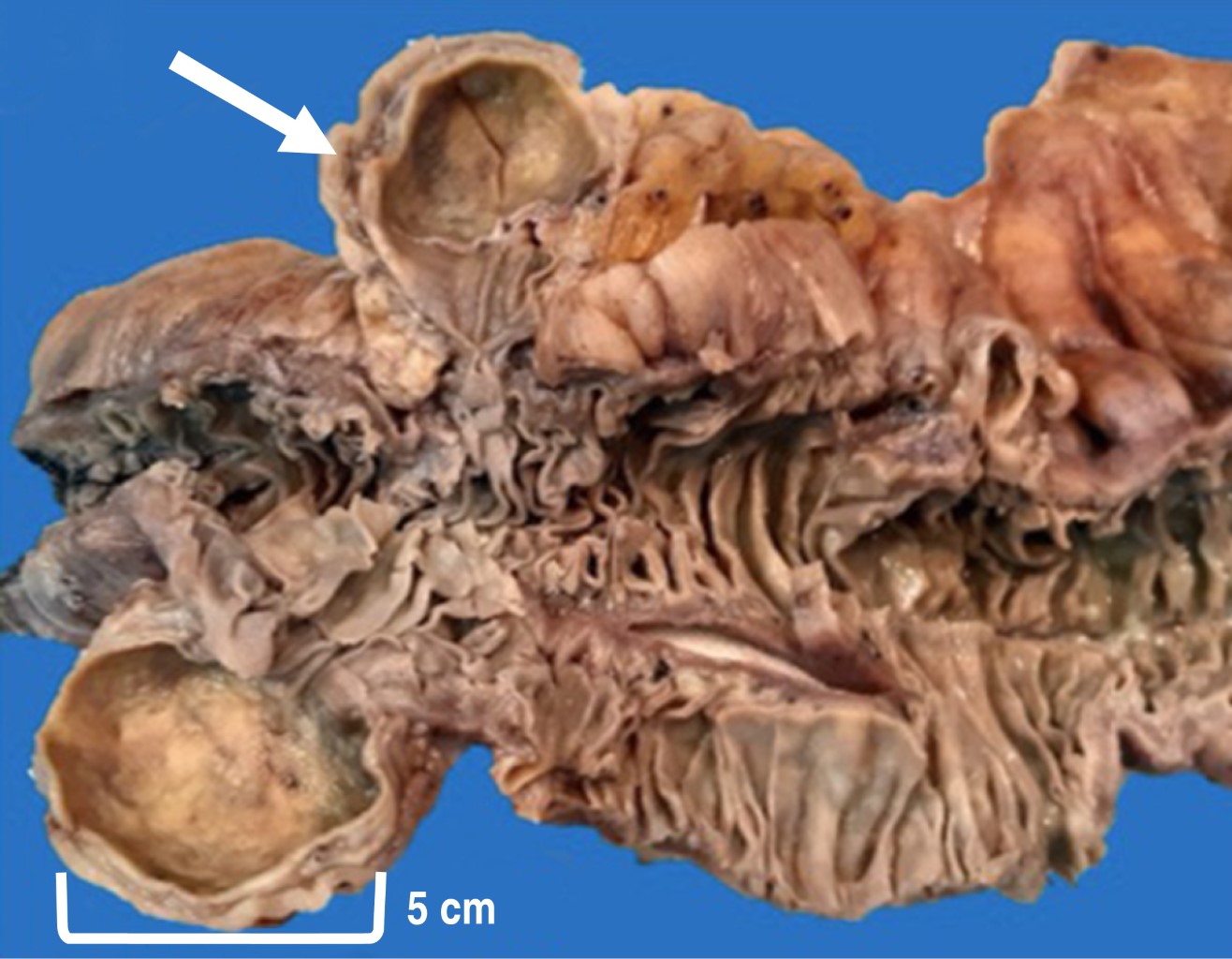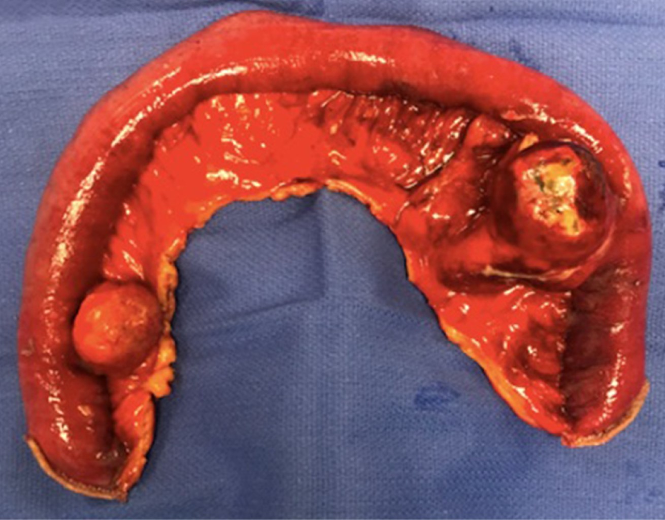 El paciente fue sometido a exploración laparoscópica, donde se corroboró la presencia de múltiples divertículos en intestino delgado (Figura 2A), uno de ellos con franca necrosis en su pared y un absceso sellado adjunto (Figura 2B). Se realizó la resección de un segmento intestinal de aproximadamente 40 cm, que incluía el divertículo perforado y otro cercano, debido a inflamación contigua (Figura 3). El tránsito intestinal se restituyó con anastomosis mano-asistida y se realizó lavado y drenaje de la cavidad abdominal. El reporte de patología corroboró la presencia de un divertículo de 5 cm de diámetro, perforado con necrosis extensa en su pared (Figura 4). El paciente tuvo una evolución sin complicaciones.
