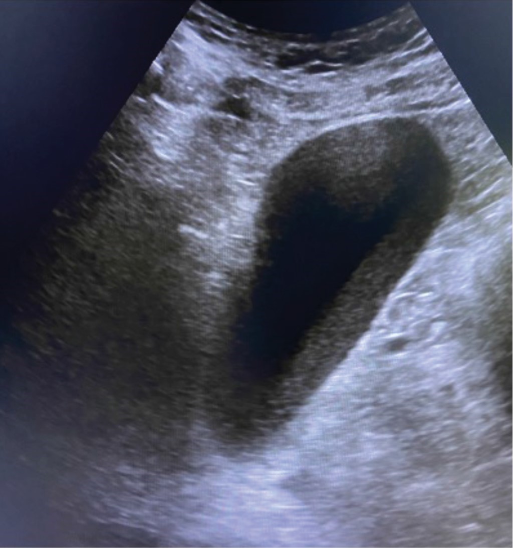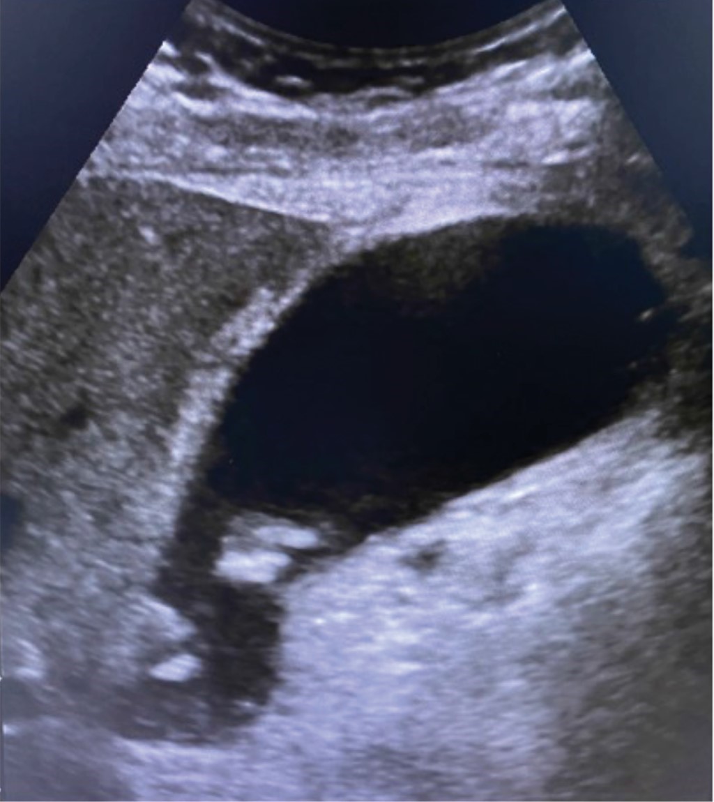 La primera imagen que presentamos muestra el ultrasonido de un paciente masculino de 70 años que acudió a urgencias por dolor epigástrico, náusea y vómito. A la exploración física no presentaba datos de irritación peritoneal o signo de Murphy, probablemente debido a que había recibido analgésicos opioides previamente. Tampoco se encontraron alteraciones en sus laboratorios de ingreso. La interpretación del ultrasonido inicial describió sólo la presencia de lodo biliar pero "sin datos de inflamación" al momento del estudio, ausencia de cálculos en su interior, distensión vesicular "satisfactoria", pared con grosor de 1.6 mm y colédoco con calibre de 3.2 mm (Figura 1).