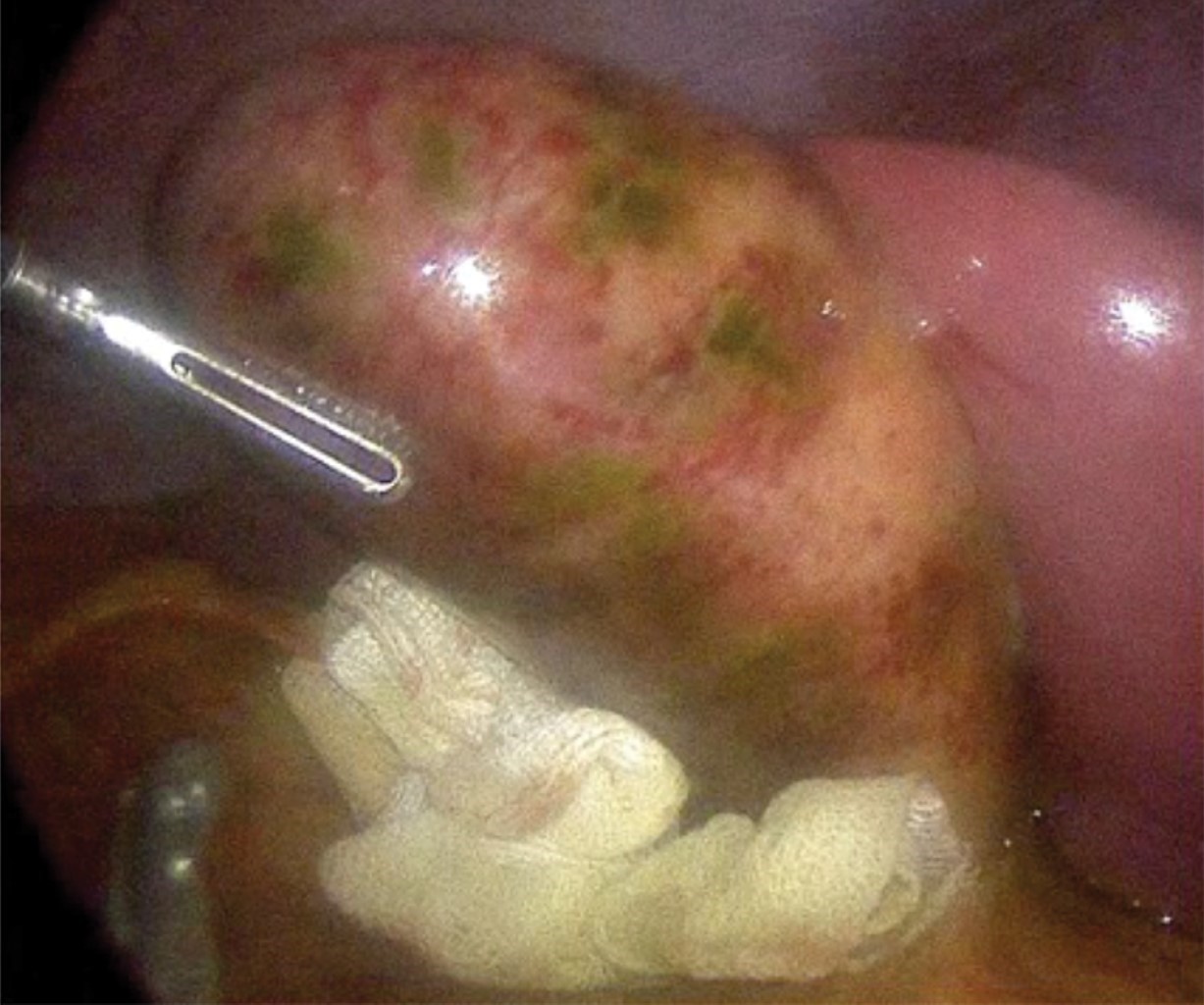 Ante la falta de diagnóstico preciso, se realizó tomografía de abdomen en donde no se pudo documentar alguna patología intraabdominal que justificara el dolor del paciente y que reportó nuevamente la presencia de lodo biliar, pero ninguna alteración vesicular o biliar agregada (Figura 2). Después de unas horas de observación sin analgésicos, el dolor volvió a incrementarse y fue más evidente su localización en el hipocondrio derecho. Un segundo ultrasonido, realizado por otro radiólogo, interpretó incremento generalizado de las dimensiones de la vesícula con franco engrosamiento parietal de 8 mm, escasa cantidad de líquido perivesicular, imagen en "tela de cebolla", signo de Murphy sonográfico positivo y ecos que ocupaban el cuello vesicular y proyectaban sombra acústica posterior (Figura 3). El paciente fue sometido a colecistectomía laparoscópica, donde se encontró vesícula severamente inflamada, con engrosamiento generalizado de su pared, gran distensión y datos de isquemia focal (Figura 4).
