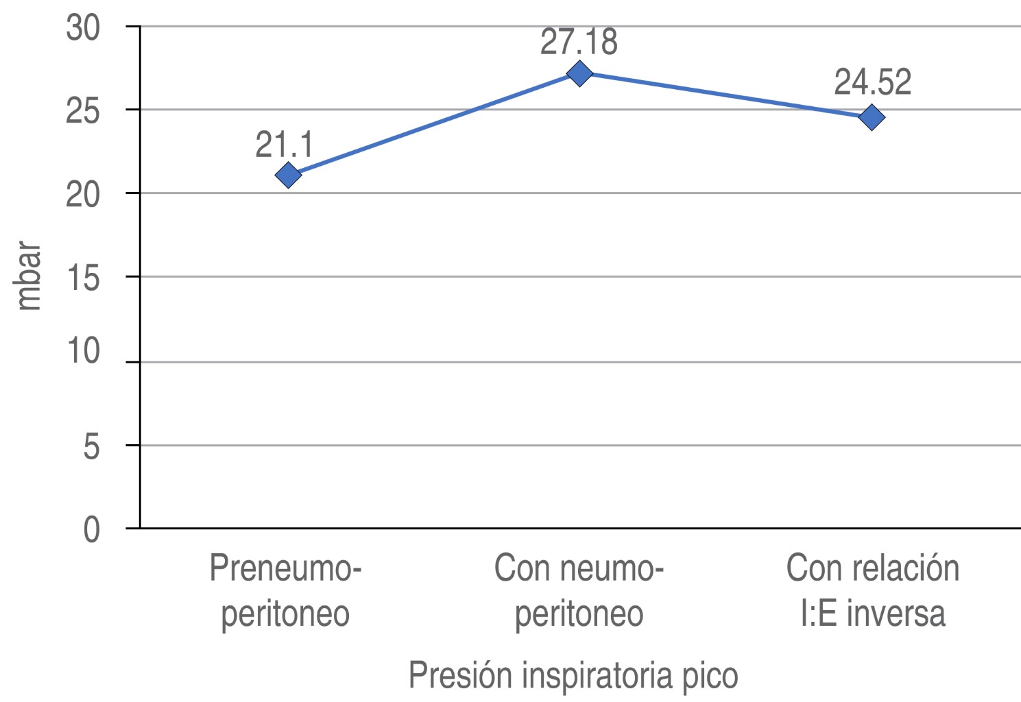 En la Figura 2 se puede observar el comportamiento de la presión inspiratoria pico antes del neumoperitoneo, después del neumoperitoneo y luego de la inversión del índice inspiración-espiración, observándose un aumento de la presión pico luego del neumoperitoneo y una disminución significativa luego de la inversión del índice.