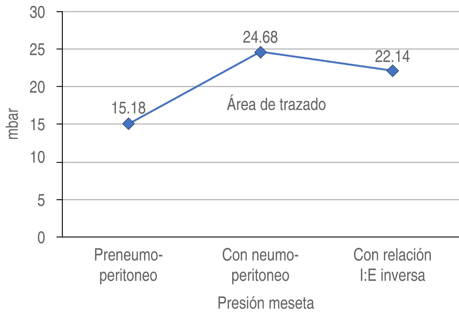 En relación a la presión meseta, vemos un comportamiento similar al de la presión inspiratoria pico, observándose un aumento de la presión meseta luego del neumoperitoneo y una disminución de la misma luego de la inversión del índice inspiración-espiración (Figura 1).