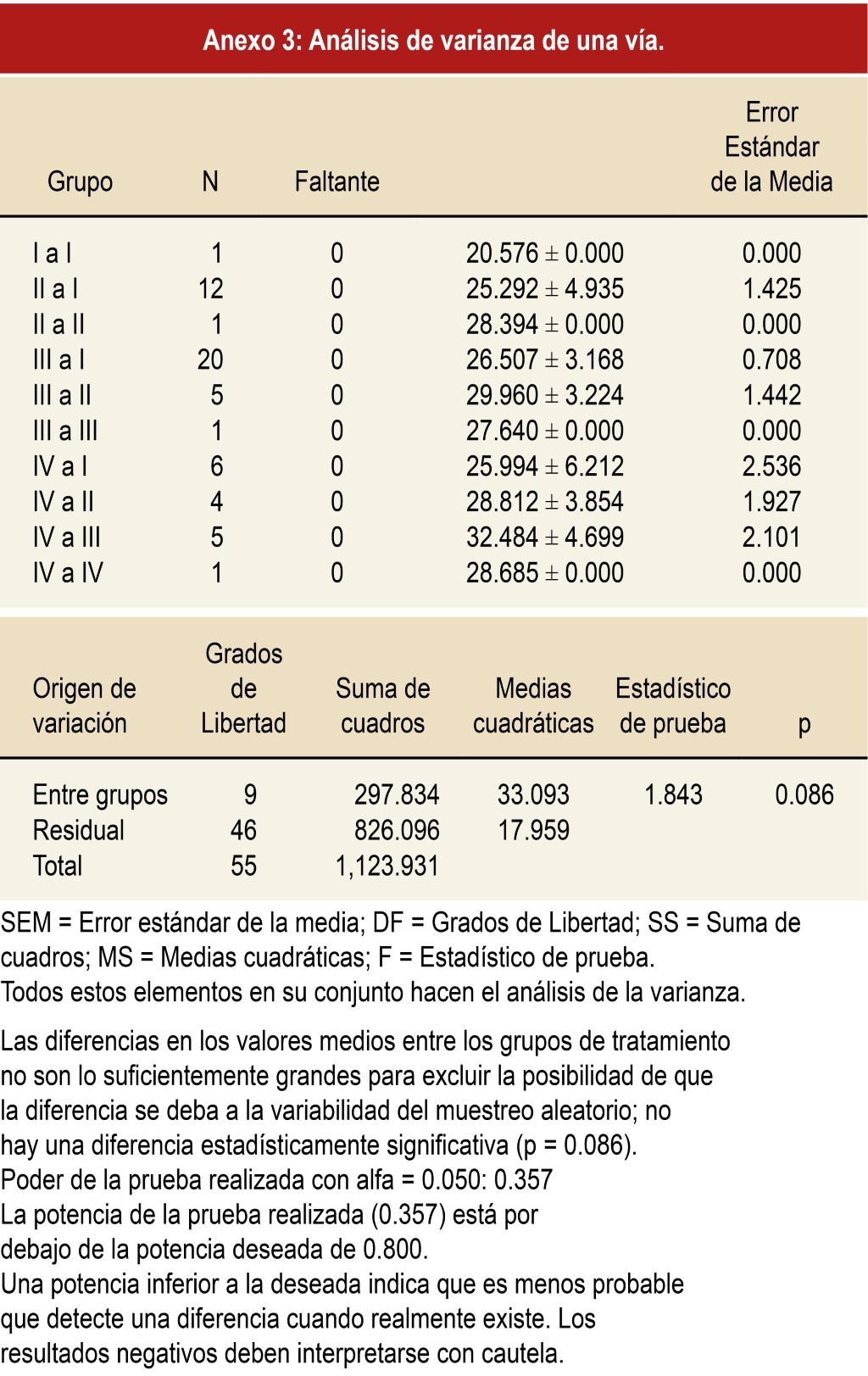La media del IMC no fue significativamente diferente entre los grupos de CL en posición MILS y CL en posición de olfateo cuando se compararon mediante ANOVA de una vía (p = 0.1; Anexo 3). No se encontraron diferencias significativas entre los valores de IMC de las diferentes combinaciones de mejoría al cambiar de posición MILS a olfateo al comparar mediante ANOVA de una vía (p = 0.086; Anexo 3).