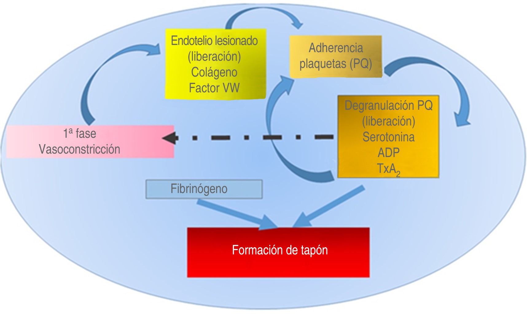 Primera fase o hemostasia primaria vascular plaquetaria. Es el período en que participan las plaquetas mediante las siguientes etapas: