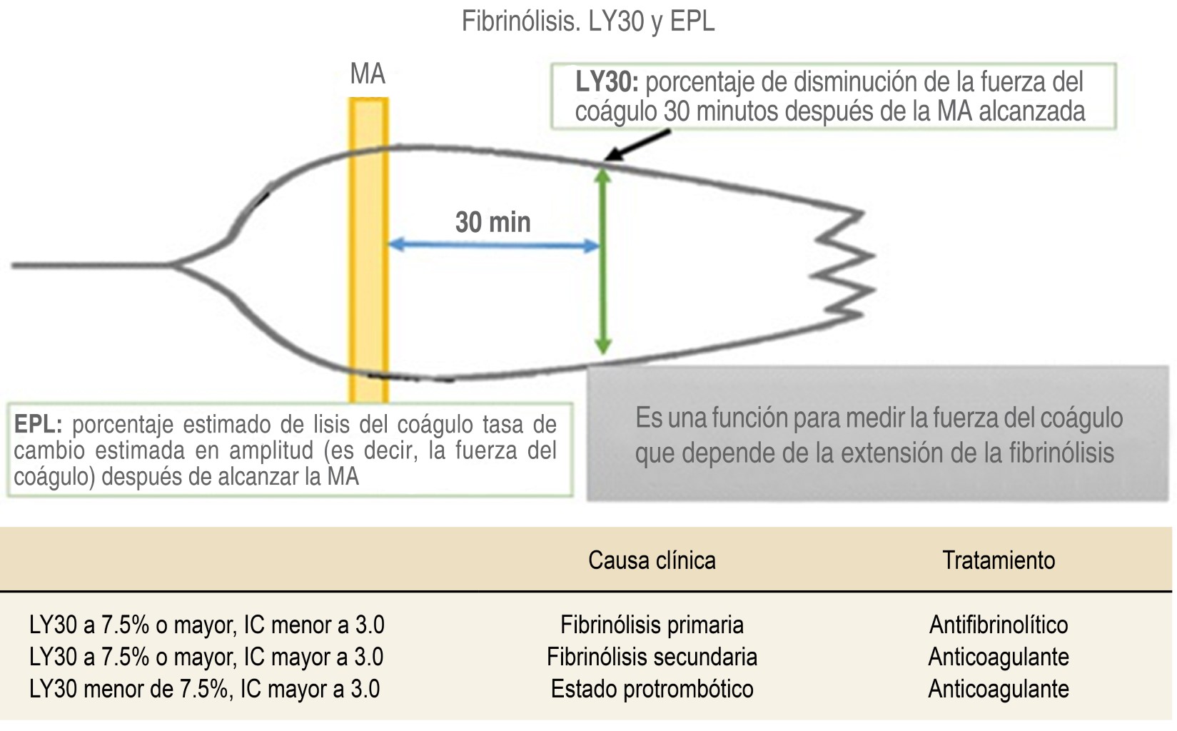 LY30: es la medida en porcentaje de la lisis del coágulo después de que ha alcanzado la máxima amplitud, reflejando la estabilidad del coágulo. Por lo tanto, se aumenta en procesos en los cuales exista fibrinólisis(14,15) (Figura 4).