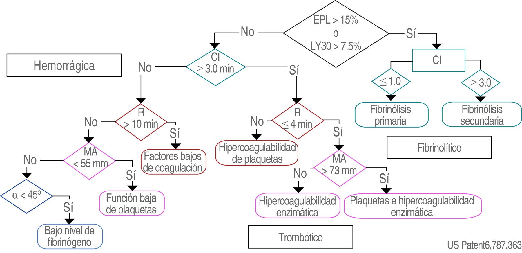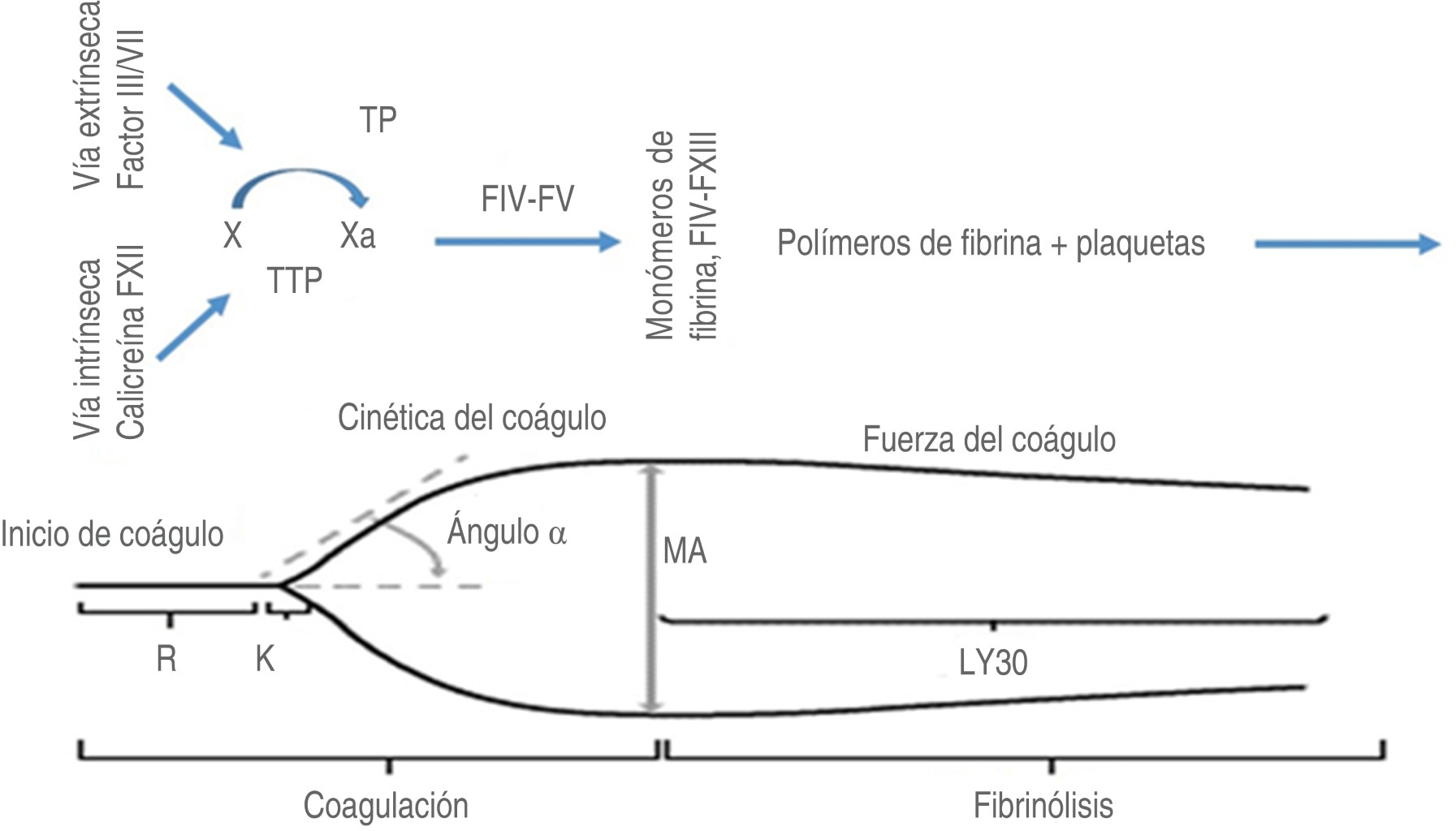 En la TEG, las mediciones del TP, TTPa y TT están representadas en la medición del R y K. La función de las plaquetas se puede observar en MA, así como el inicio de la lisis del coágulo (Figura 5).