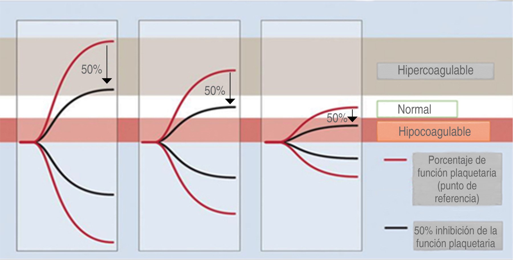 Muchos protocolos quirúrgicos suspenden la administración de inhibidores plaquetarios como lo son el clopidogrel o el ácido acetilsalicílico antes de una cirugía para minimizar el riesgo de sangrado, pero ¿qué pasa si interrumpimos una medicación antiplaquetaria en un paciente que está predispuesto a un evento trombótico? Al facilitar o inhibir la función plaquetaria antes de la cirugía sin entender el estado basal del paciente podríamos ponerlo en riesgo de sufrir una hemorragia o una trombosis e incrementar el costo de su cuidado perioperatorio. Si se le suministra una dosis demasiado baja de antiagregante plaquetario postoperatoria podría ocurrir una trombosis, mientras que si se le suministra demasiada inhibición podría presentarse sangrado. El ensayo del mapeo plaquetario (Platelet Mapping® Assay) mide la función plaquetaria y muestra el nivel de inhibición de la agregación plaquetaria del paciente y el riesgo trombótico o hemorrágico. Evaluando el efecto de las drogas administradas para sus diferentes tratamientos, la medición del mapeo plaquetario se logra a través del ADP o ácido araquidónico modificando la medición del MA e inhibiendo los efectos de los agentes antiplaquetarios, los resultados se presentan en una interpretación de porcentaje de inhibición(19) (Figura 12).
