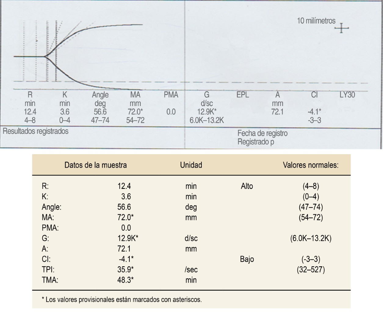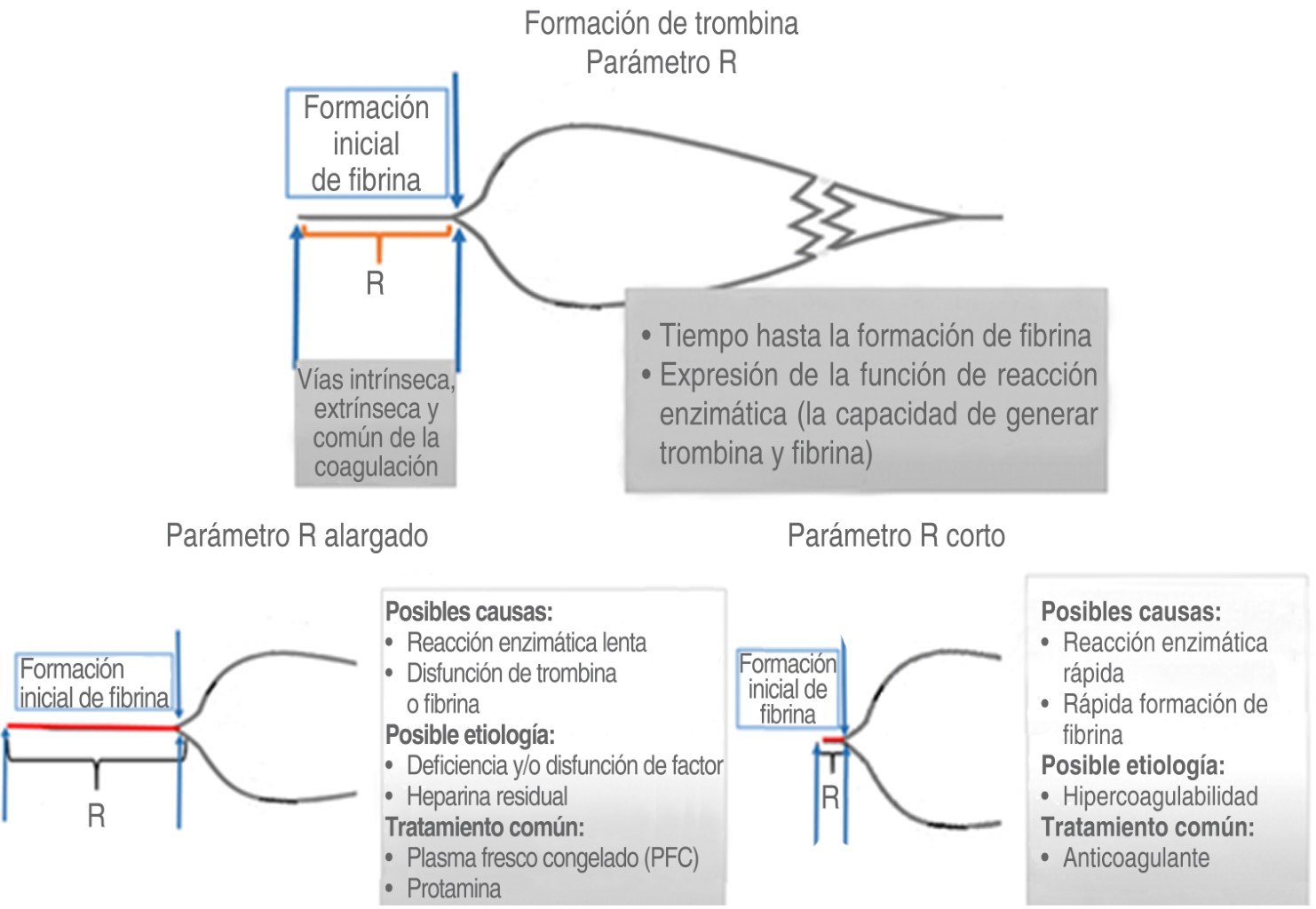 Tiempo de reacción (R): es el tiempo transcurrido desde que se coloca la muestra hasta que empieza la formación de las primeras bandas de fibrina. Puede prolongarse cuando existen deficiencias de factores de la coagulación, como la acción de la heparina, warfarina o las heparinas de bajo peso molecular. Su acortamiento implica hipercoagulabilidad de cualquier etiología y representa la funcionalidad de los factores de coagulación(7,15,16).