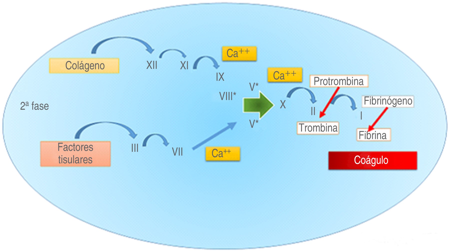 Segunda fase plasmática o de amplificación. La fase de amplificación es dependiente de la presencia de membranas plaquetarias activadas y de la interacción de éstas con los factores de coagulación. Se forma la trombina (factor II), junto con el calcio (factor IV) y los fosfolípidos (que provienen de la plaqueta), participan activamente en un proceso de retroalimentación para la activación de los factores XI, IX, VIII, V y para acelerar la activación de las plaquetas(6,7).