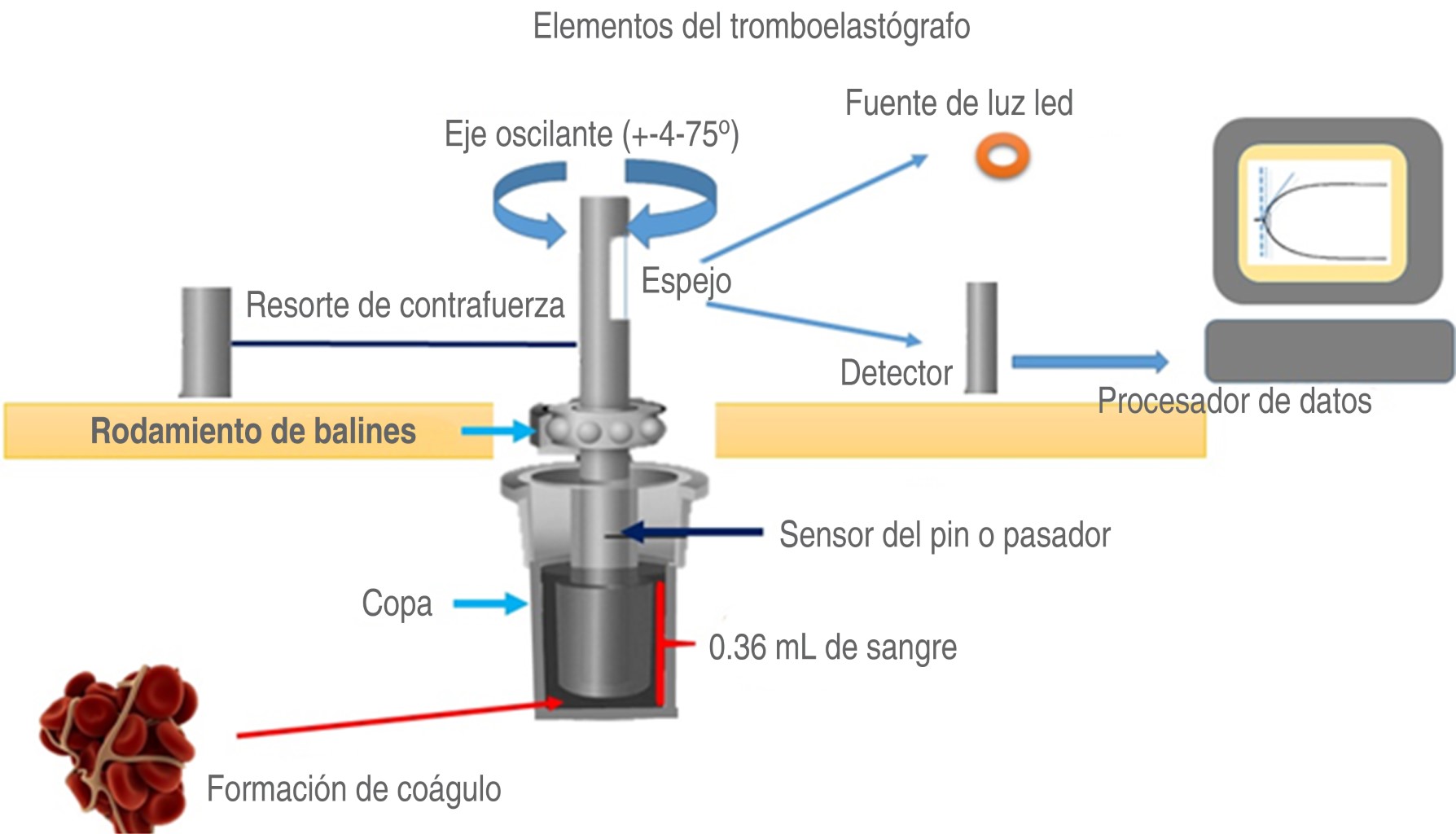 Esta prueba se realiza in vitro, empleando una cubeta o copa en donde se depositan 0.36 mL de sangre, la cual se gradúa previamente de acuerdo con la temperatura del paciente. La muestra es sometida a un proceso de rotación, la sangre depositada en la copa, se encuentra en contacto con un pin o pasador, el cual está suspendido libremente dentro de la muestra y que, a su vez, está conectado por un extremo a una guía o cable de torsión que lo hace girar; a medida que la sangre coagula y modifica la resistencia del pin; estas variaciones obtenidas por las características del coágulo y de su etapa evolutiva, son registradas por un transductor electromecánico, el cual, convierte la rotación del pin en una señal eléctrica, graficando así las distintas etapas de la coagulación, es decir, la formación de la fibrina, la retracción del coágulo, la agregación plaquetaria y la lisis del coágulo (Figura 3)(14).