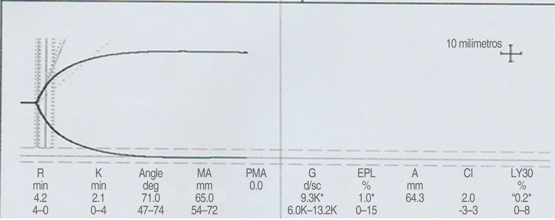 Constante de coagulación (K): tiempo que transcurre desde el comienzo de la formación de fibrina hasta que el coágulo alcance 20 mm, es decir, evalúa el tiempo de formación del coágulo(14,15).