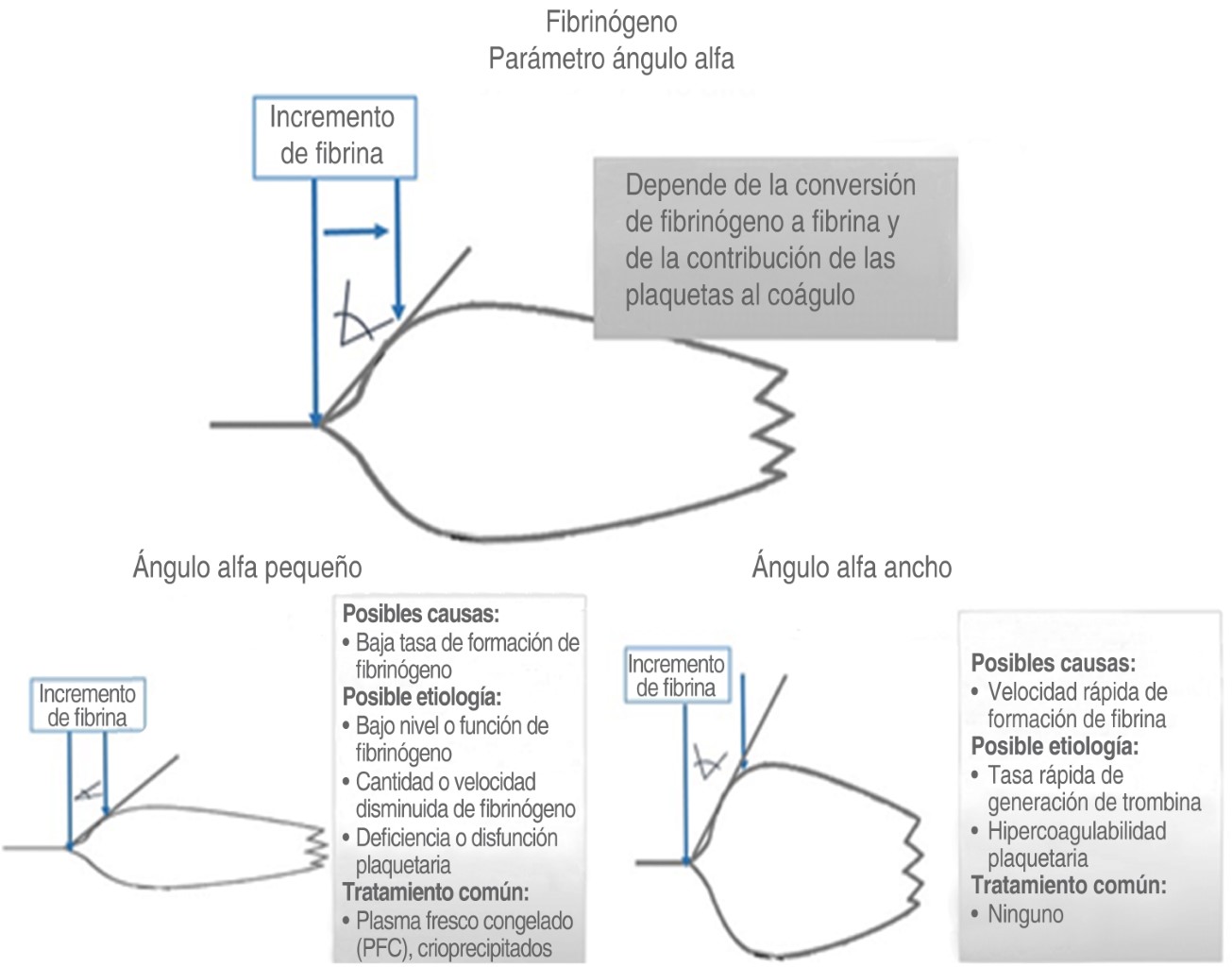 Ángulo alfa: es la velocidad de formación del coágulo. La angulación aumenta cuando existe hiperagregabilidad plaquetaria o elevación del fibrinógeno, y disminuye en presencia de agentes anticoagulantes o de antiagregantes plaquetarios, representa principalmente la funcionalidad del fibrinógeno(13-15).