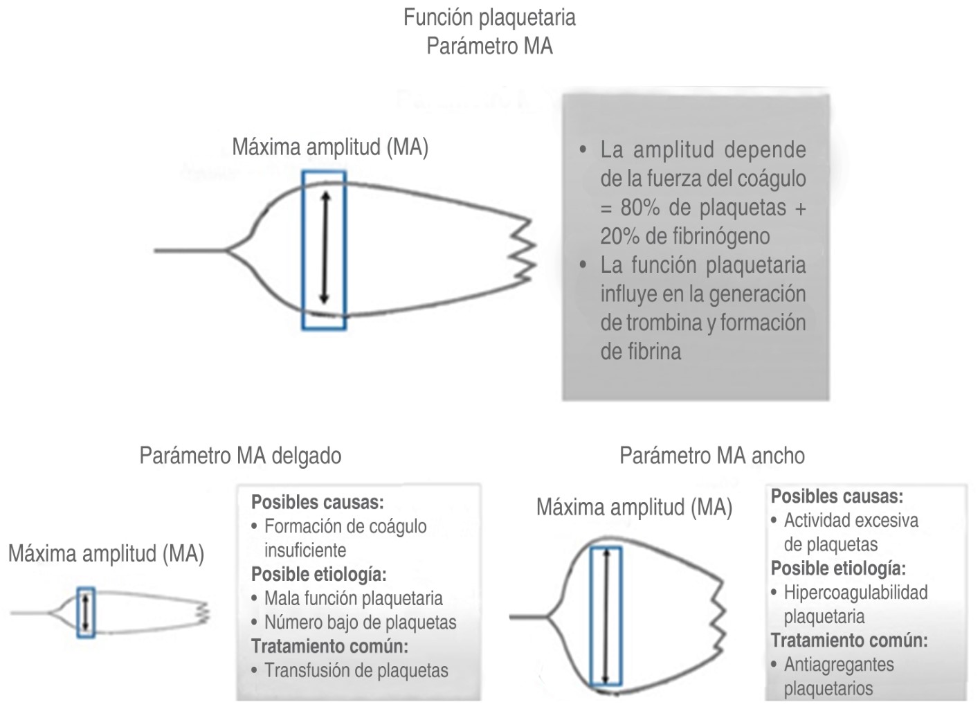 Amplitud máxima (MA): se mide en milímetros y evalúa el momento en que el coágulo alcanza su máxima fuerza, representa principalmente la función plaquetaria(14-16).