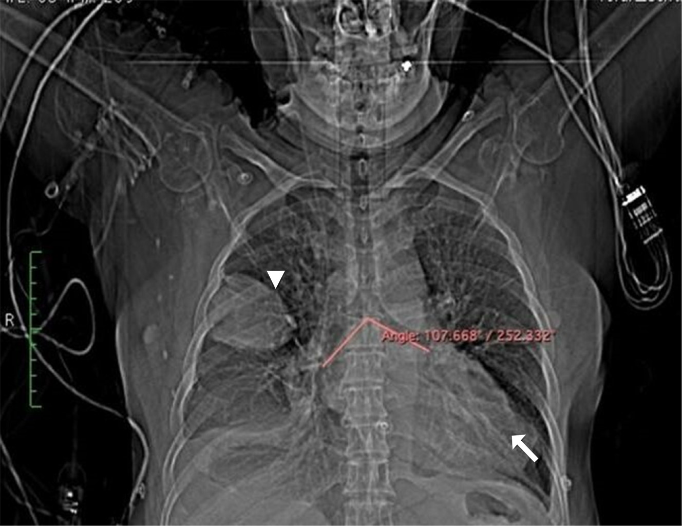 A la exploración física con peso 69 kg y talla 163 cm, despierta, tranquila, cooperadora, buena coloración mucotegumentaria, cráneo normocéfalo, ojos simétricos con pupilas isocóricas, normorreflécticas, mucosa oral húmeda, anodoncia parcial; cuello cilíndrico, tráquea central, móvil; tórax normolíneo, buena amplexión y amplexación, ruidos respiratorios normales no sibilancias ni estertores, ruidos cardíacos rítmicos adecuada intensidad, abdomen semigloboso por panículo adiposo, blando, depresible, no doloroso, extremidades con leve edema en miembros inferiores, simétricas, pulsos distales presentes, normales, llenado capilar menor a tres segundos. El electrocardiograma mostró ritmo sinusal, necrosis en cara inferior, resto normal. El ecocardiograma reportó cardiopatía isquémica, dilatación ligera de sus diámetros, geometría conservada, movilidad global y segmentaria del VI en reposo y sin maniobras inductoras de isquemia con acinesia lateral apical y anterolateral mediobasal con espesor limítrofe e hiperrefringencia, sitio en donde se visualiza solución de continuidad a nivel del miocardio ventricular con cociente menor de 0.5, flujo bidireccional con expansión sistólica correspondiente a imagen de pseudoaneurisma ventricular, fracción de eyección del ventrículo izquierdo de 40%, presión sistólica de la pulmonar de 42 mmHg, media normal resistencia vascular periférica (RVP) menor de tres unidades Wood. La coronariografía mostró circunfleja lesión de 80% antes de la bifurcación con la obtusa marginal, la cual tiene lesiones en todo su trayecto de 80% en tándem, arteria menor de 2 mm, además de hipocinesia generalizada y dilatación ventricular importante, resto sin lesiones angiográficas. La tomografía de tórax mostró dilatación aneurismática de la pared externa del ventrículo izquierdo de 60.6 × 78.7 mm de diámetro transverso y anteroposterior respectivamente y en su parte latero-superior parece advertirse un pequeño punto de fuga hacia cavidad pericárdica, sin evidencia de extensión hasta cavidad pericárdica (Figuras 1, 2 y 3).