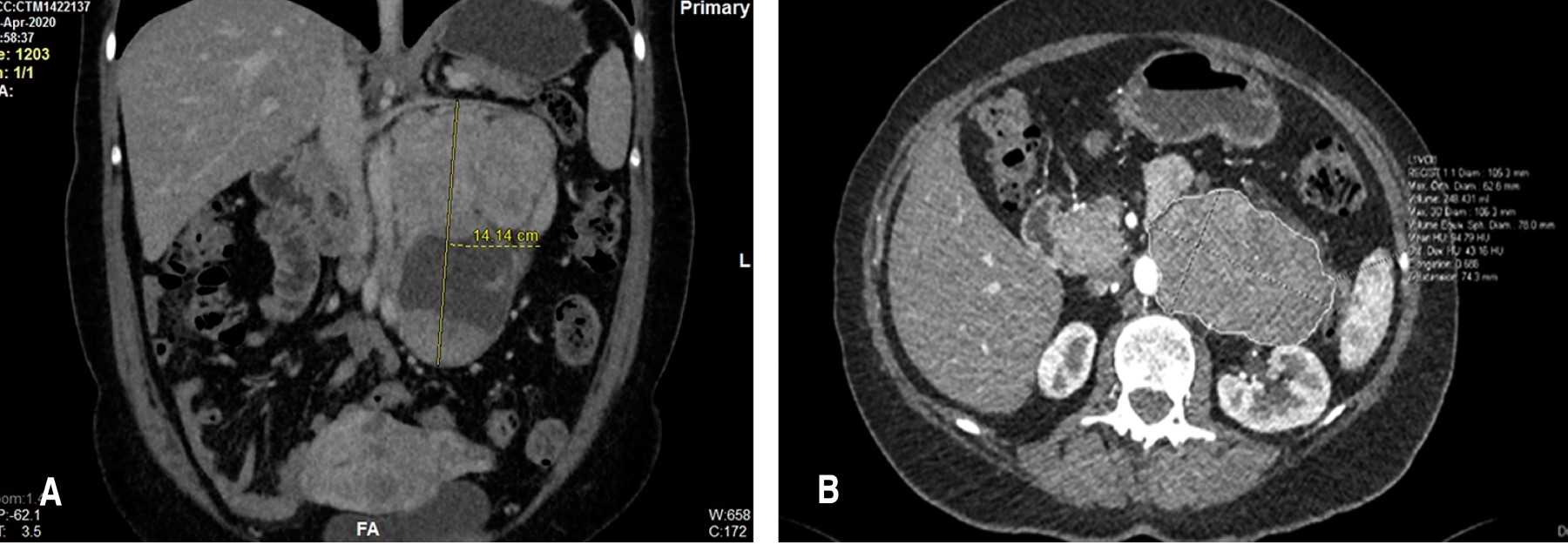 Mujer de 56 años, quien tras abordaje de cuadro apendicular, se reportó en tomografía abdominal lesión sólida-quística retroperitoneal paraaórtica izquierda, asociado a ganglio precaval y adenopatías en cadena obturatriz e iliaca externa derecha. Al interrogatorio dirigido, negó presencia de síntomas abdominales, dolor lumbar, cambios ponderales, o alteraciones en la sensibilidad o motricidad de miembros pélvicos. En la tomografía con contraste intravenoso se identificó a nivel paraaórtico presencia de lesión tumoral heterogénea a expensas de contenido sólido y líquido, presentando dimensiones de 9.7 × 3.3 × 7.6 cm.
