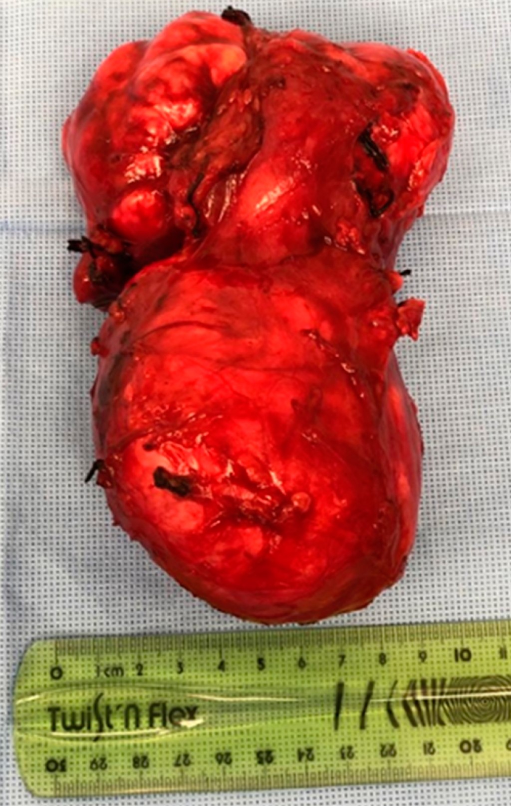 El tratamiento de esta patología consiste en una resección quirúrgica en bloque, márgenes microscópicos negativos (RO). La obtención de márgenes negativos requiere de una planeación quirúrgica individualizada, con adecuada visualización de estructuras involucradas. Es importante obtener márgenes negativos, ya que aunque se considera un tumor benigno, existe el riesgo de malignidad.1,3,4 Estos tumores suelen tener una pseudocápsula, una membrana delgada, translúcida, que puede contener lesiones satélite pequeñas. Si la cápsula no se reseca en su totalidad, estas pequeñas lesiones pueden desarrollarse en recurrencia local.5 Gold y colaboradores reportaron la presencia de márgenes microscópicos positivos en 40% de recurrencias locales y en 75% de metástasis.1 Existen múltiples estudios que han valorado la utilización de quimioterapia y radioterapia; sin embargo, dada la baja tasa de malignidad, no se ha comprobado su utilidad.4 Existen reportes de la utilidad de radioterapia neoadyuvante para reducir el tamaño del tumor, y después realizar una resección quirúrgica completa.5