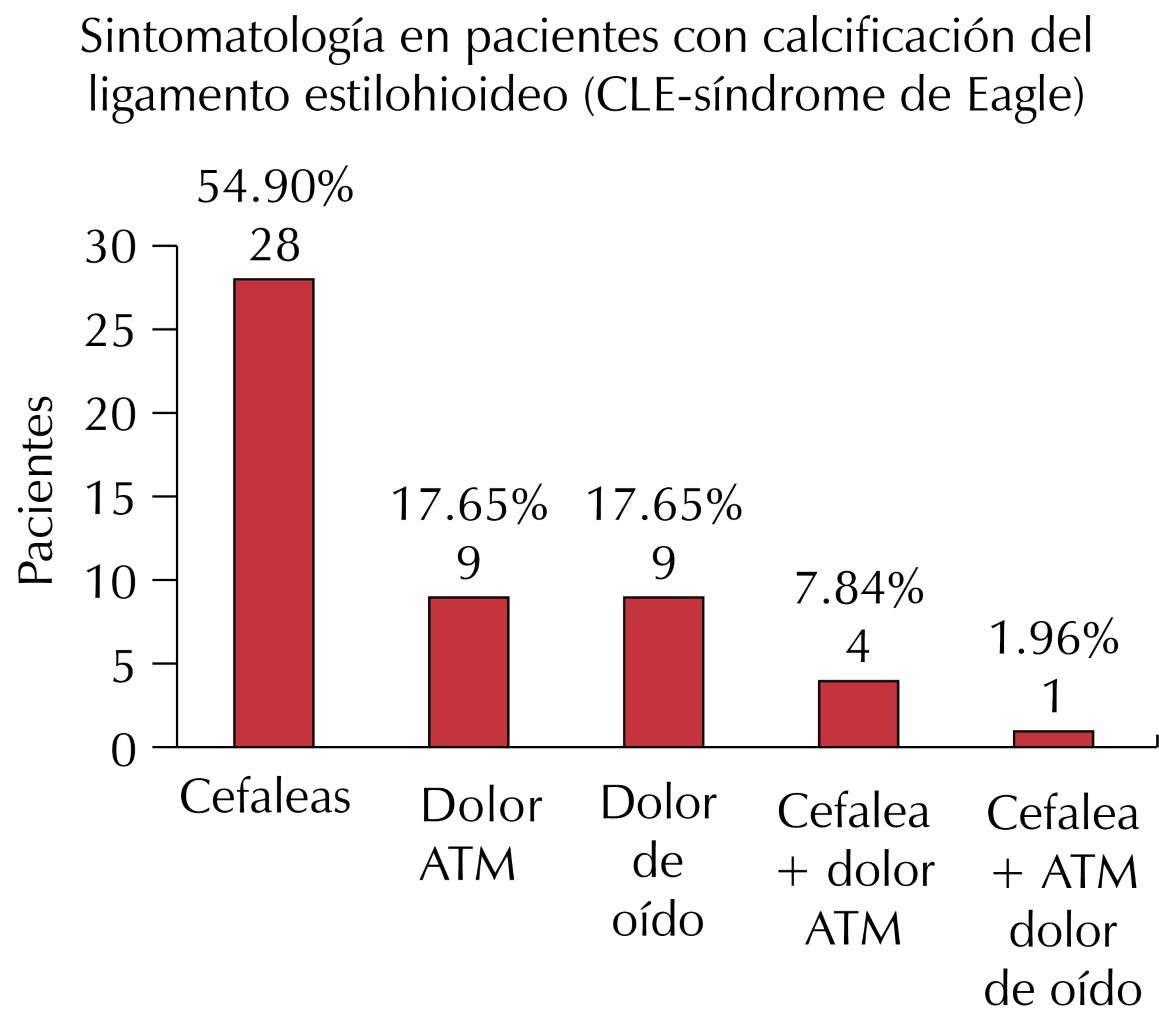 Respecto a la muestra de CLE (Figura 3), el expediente clínico de 51 pacientes indica que presentaron síntomas relacionados con síndrome de Eagle (SE), mismos que se describen en la Figura 4. Otras de las patologías encontradas fueron las calcificaciones de la carótida en 18 casos (Figura 5), sin que se asociaran con alguna manifestación clínica, o hubieran sido detectadas en el expediente clínico.7,8