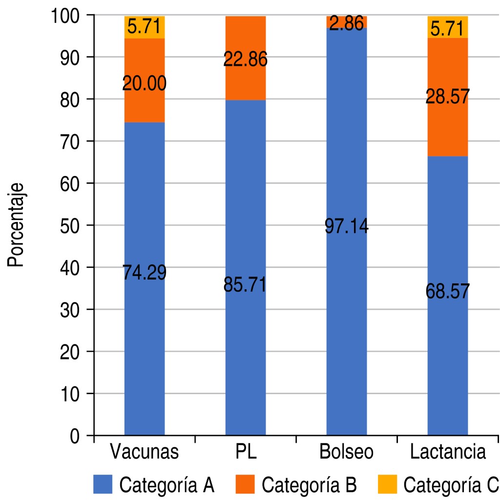Si observamos lo sucedido con la variable de resultado o outcome (porcentaje de participantes en categoría A sin errores graves y con más de 80 puntos de calificación global), observamos valores muy satisfactorios en las estaciones de punción lumbar y lactancia materna (84 y 77%), intermedios en vacunación (72%) y todavía mejorables en VPBM (55%).