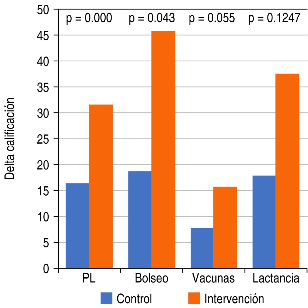 Al analizar el desempeño antes y después de la intervención, se encontró que todos los grupos mejoraron significativamente en todas las habilidades evaluadas. Sin embargo, los grupos que recibieron la intervención tuvieron una mejoría significativamente mayor, salvo en la estación de lactancia, donde se evidenció una mejoría marginal. Si bien por las características del estudio no es posible atribuir los resultados de la mejoría exclusivamente a la intervención, hay varios puntos que cabe destacar. Se descarta que las diferencias se deban a un sesgo de selección dado que ambos grupos estaban balanceados en cuanto a su conocimiento inicial. Se demostró que no se debía al paso del tiempo porque no se encontraron diferencias significativas entre participantes de primero y segundo año de la carrera. Por último, todos los participantes expuestos a la capacitación mejoraron su desempeño.