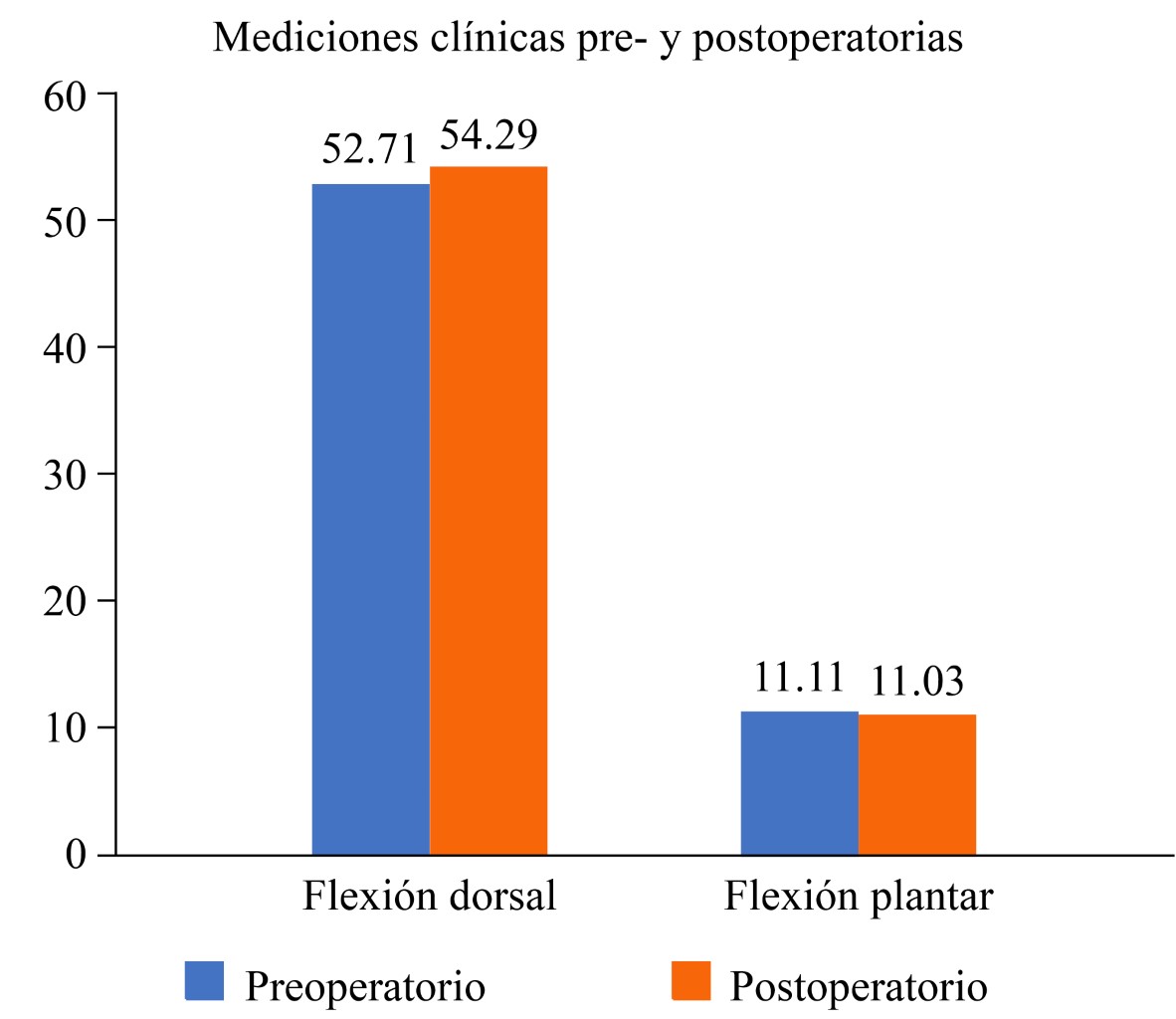 En cuanto a la movilización del dedo, la flexión dorsal cambió de 52.71o a 54.29o a los dos años de seguimiento, diferencia que no es estadísticamente significativa. La flexión plantar pasó de 11.11o a 11.03o también sin diferencia significativa. Estos valores reflejan que la movilidad del primer dedo de nuestros pacientes tras el procedimiento se mantuvo al menos igual que previo al procedimiento quirúrgico (Figura 2).