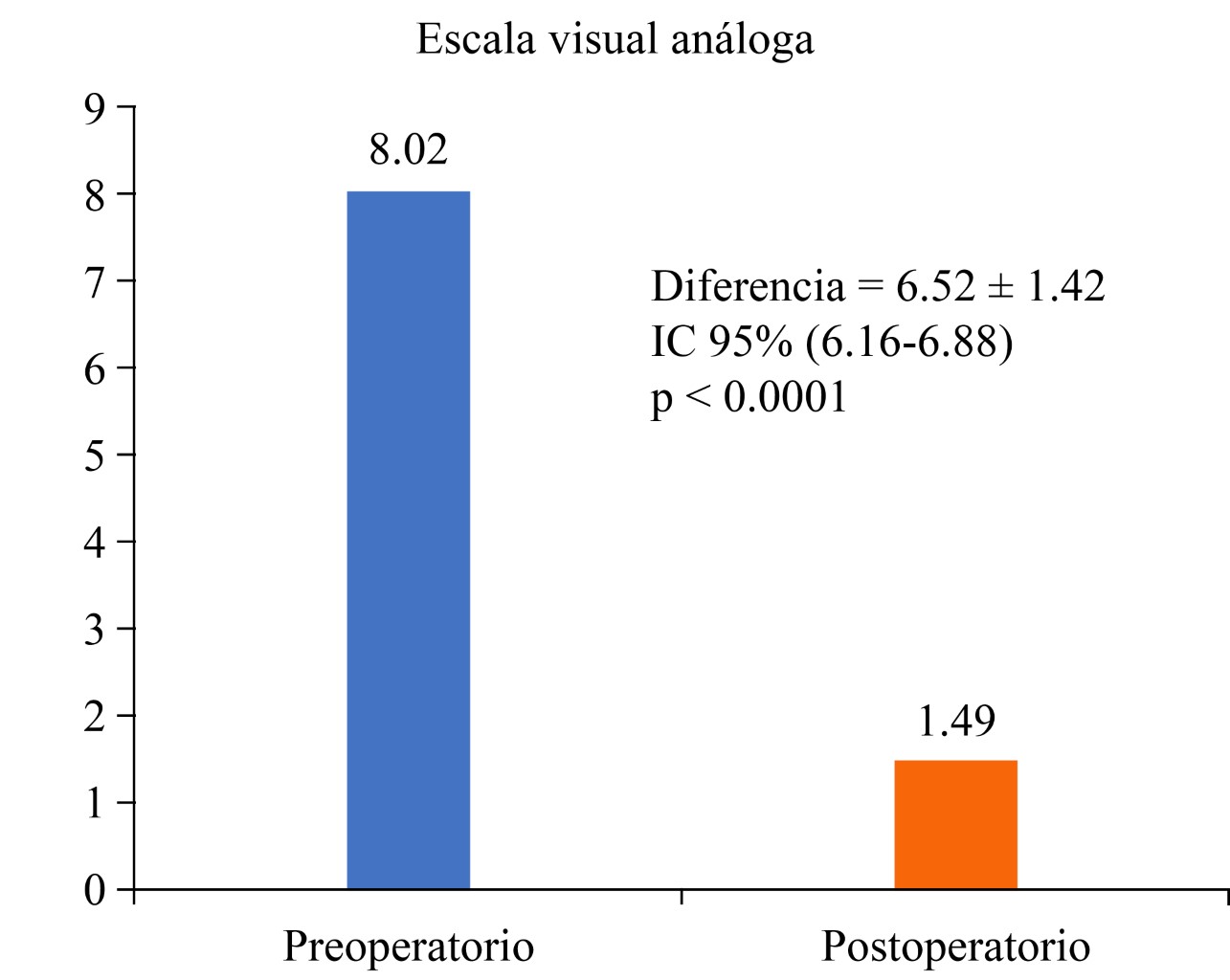 En cuanto a la escala visual análoga del dolor (Figura 5), logramos pasar de más de 8 puntos de dolor a 1.49 puntos en promedio.