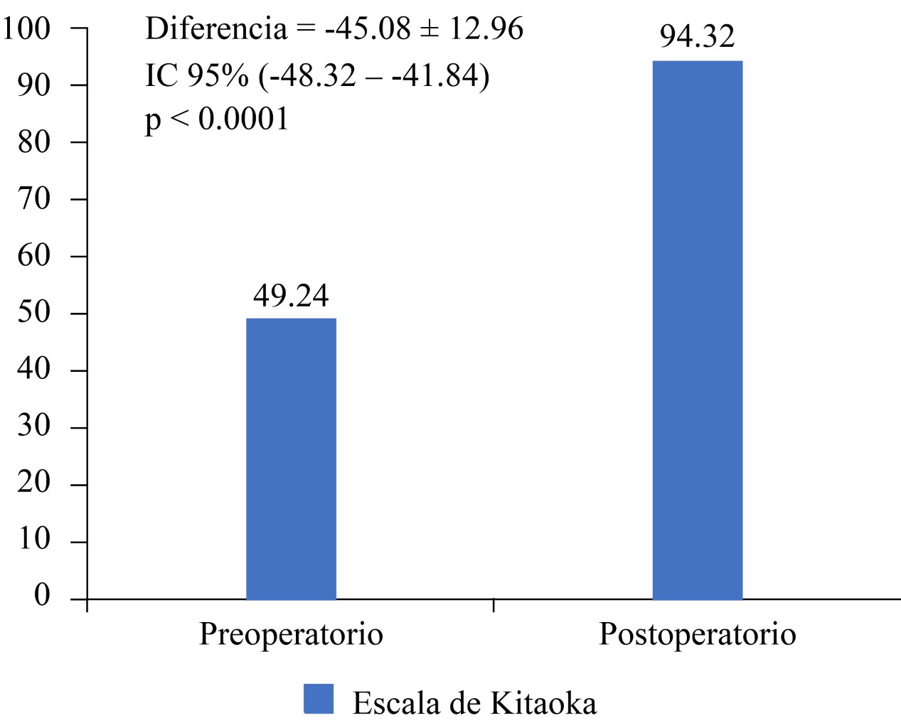 A todos nuestros pacientes les aplicamos en el pre- y postquirúrgico la escala de Kitaoka ahora conocida también como escala AOFAS, la cual fue desarrollada en 1994 y es una de las más utilizadas en la actualidad. Con esta escala podemos valorar de forma objetiva y ordenada la mejoría de nuestros pacientes.8 Esta escala, que consta de 100 puntos, combina la alineación de muestro primer metatarsiano (10 puntos), el dolor que presenta nuestro paciente (40 puntos) y la funcionalidad al evaluar las actividades que puede realizar (50 puntos). En nuestros pacientes, la evaluación funcional fue de 49.24 puntos prequirúrgicos a 94.32 puntos en el postquirúrgico. Con una diferencia media de 45.08 puntos, lo cual es estadísticamente significativo (Figura 6).