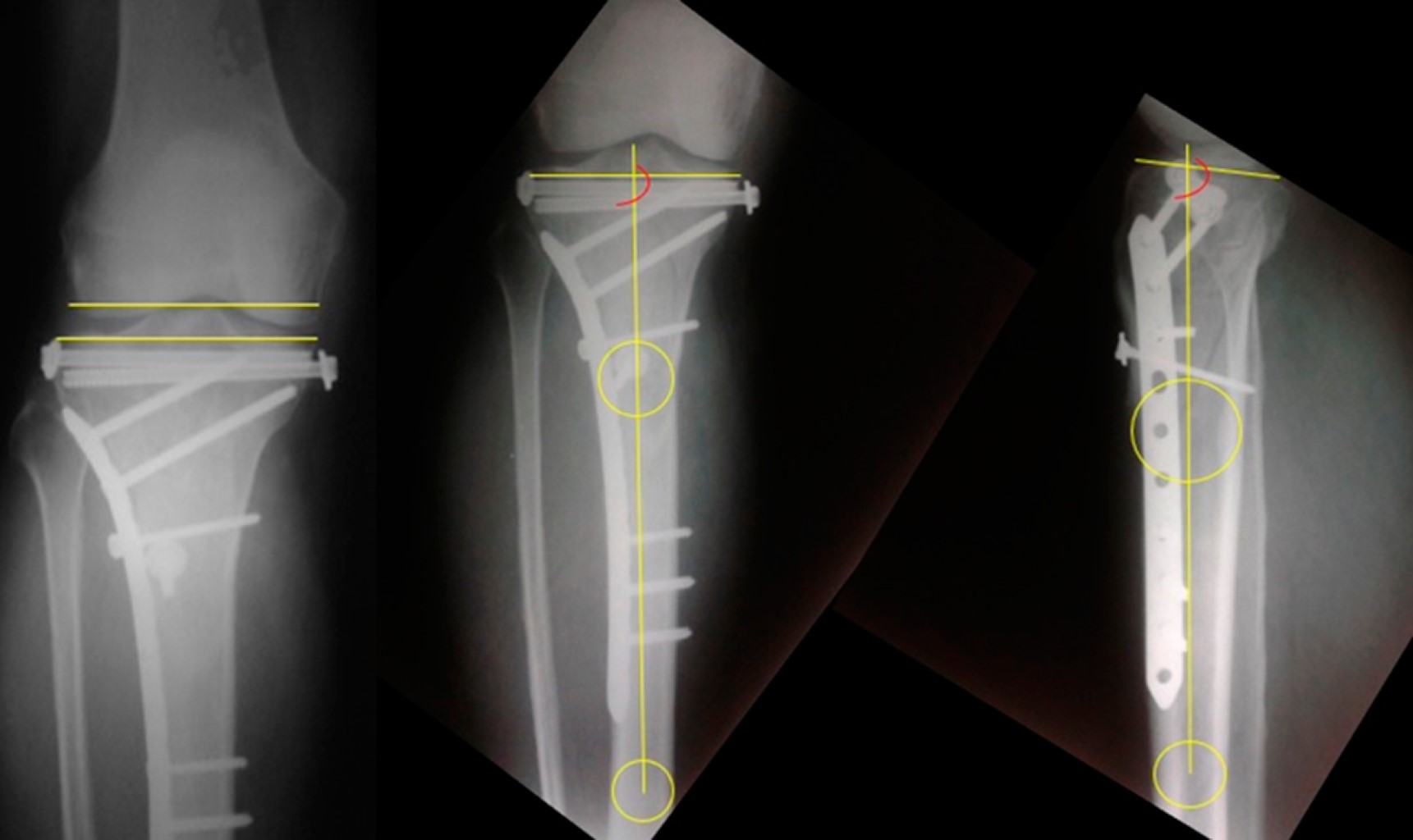 Las fracturas de platillo tibial por alta energía son lesiones graves que ocurren sobre una articulación de carga. Son difíciles de manejar, ya que además de afectar la estructura ósea, suelen tener lesiones de partes blandas asociadas con el desarrollo de flictenas.1 Este tipo de lesiones de alta energía con frecuencia tienen afectación concomitante de otra región del organismo. Ocasionalmente durante el tratamiento y/o al finalizarlo se presentan complicaciones tales como dolor, rigidez articular, desviaciones del eje, artritis postraumática e infecciones, entre otras.2 Con el fin de disminuir la aparición de las mencionadas complicaciones se instaura tratamiento en etapas (estabilización inicial con fijador externo y osteosíntesis diferida),2 pero aún permanecen elevadas.3,4 Hay consenso en que la congruencia articular y los ejes son puntos clave en la evaluación objetiva de resultados, al igual que el ensanchamiento articular tibial postoperatorio.5 La estratificación del tratamiento supone una herramienta fundamental que influye positivamente en los resultados.2 Es por esto que se requiere de un equipo entrenado para afrontar tamaño desafío.
