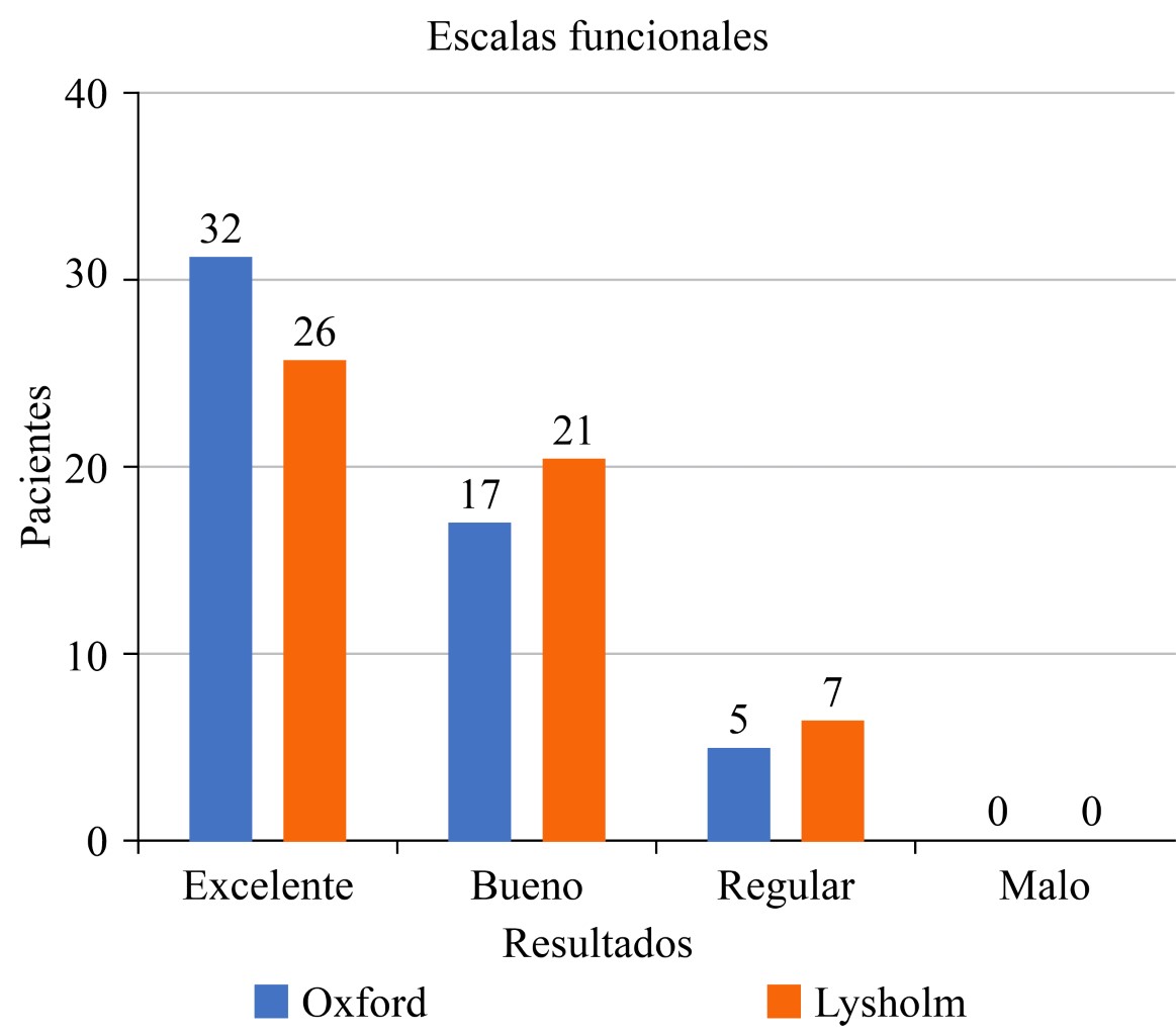 Evaluación clínico funcional: se midió con goniómetro el rango de movilidad articular de rodilla al alta, tomando de 0-140 como rango fisiológico.9 Para evaluar la funcionalidad y el nivel de dolor referido por el paciente se utilizaron las escalas de Lysholm y Oxford Knee Score (OKS).10,11
