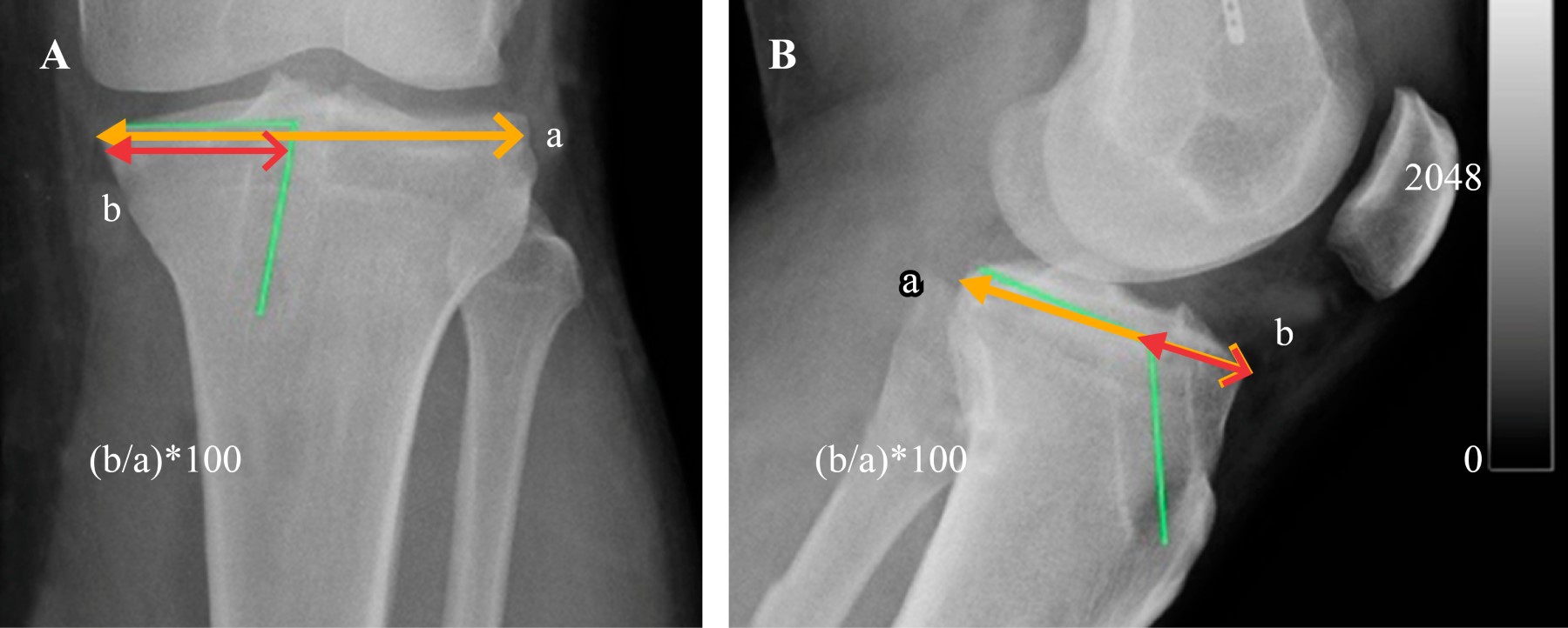 Para evaluar la ubicación del túnel tibial6 se midió la ubicación en porcentaje de la localización con respecto al platillo tibial en el frente, se midió el ancho del platillo tibial y la distancia entre el extremo medial del platillo y el centro del túnel tibial expresado en forma porcentual. En el perfil se midió la distancia anteroposterior del platillo tibial interno y la distancia de la cara anterior de la tibia al centro del túnel tibial expresado en forma porcentual. El ángulo del túnel tibial en el frente es evaluado por una línea que pasa por el platillo tibial interno y su intersección con una línea que pasa por el centro del túnel tibial. El ángulo de inclinación del túnel tibial en el perfil es medido por una línea que pasa por el platillo tibial interno de anteroposterior y otra línea que pasa por el centro del túnel tibial que lo intercepta (Figura 2).