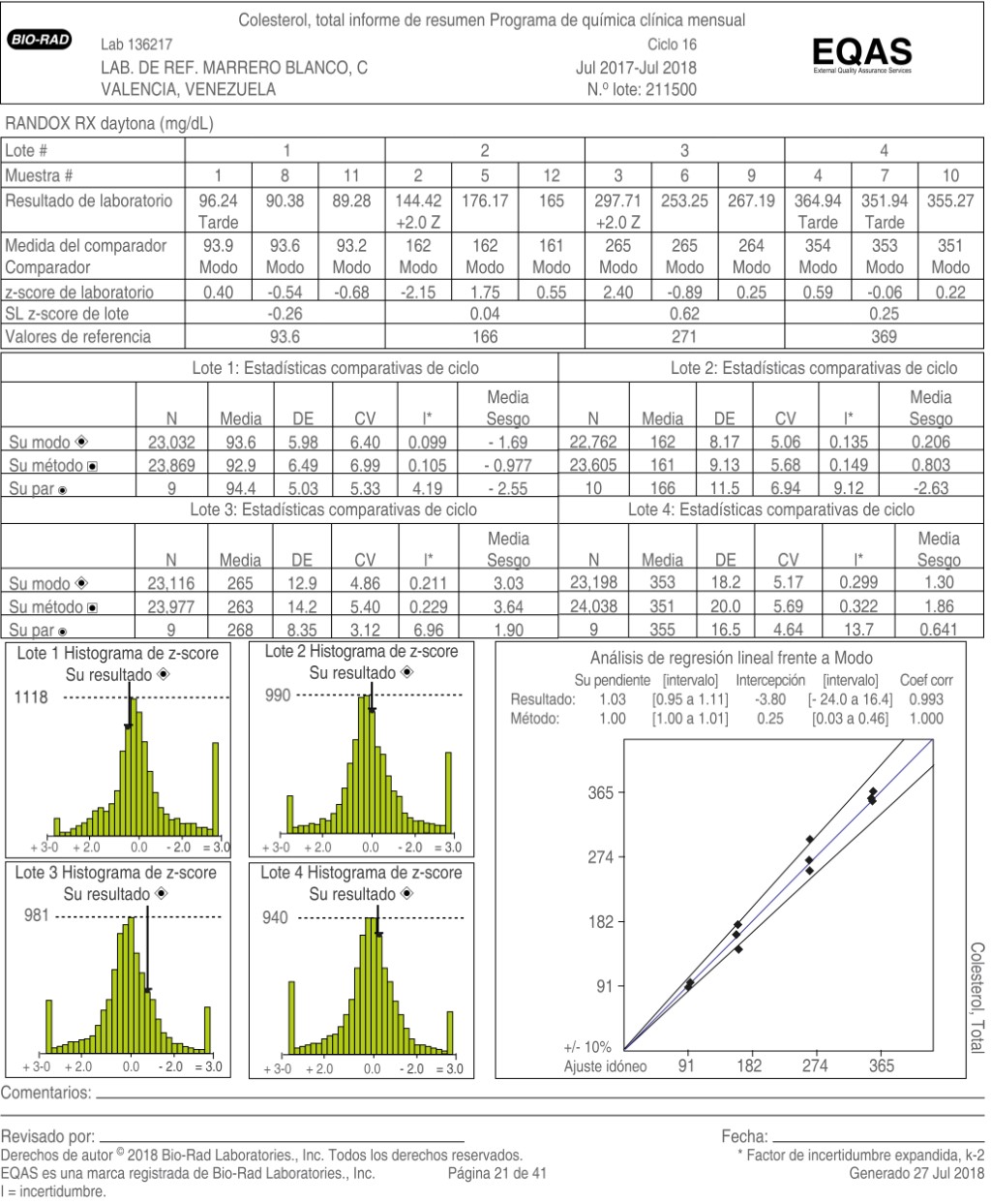 El punto clave en medicina basada en la evidencia radica en el laboratorio clínico, donde es clara la necesidad de contar con un sistema de gestión de la calidad y de competencia técnica, ya que es allí donde se generan más de 70% de las decisiones médicas.17 Es por ello que se desarrollan programas como EQAS, el cual es un programa de evaluación externa de la calidad, acreditado bajo la norma internacional ISO/IEC 17.043: 2010, con aceptación a nivel mundial y que permite evaluar periódicamente el desempeño del laboratorio e identificar las áreas con oportunidades de mejora, además de monitorear permanentemente el rendimiento de sus métodos de análisis. Cuando el programa se utiliza junto con controles de calidad de tercera opinión, como es el caso del Laboratorio de Referencia "Marrero Blanco", éstos programas pueden dar la confianza al reportar los resultados de las pruebas del paciente, ya que dicha evaluación es llevada a cabo por parte de un organismo internacional.18 Durante los años de participación consecutivos en el programa, el laboratorio clínico demostró tener resultados basados en la evaluación del método analítico o por su par, ya que se contó con estabilidad en los factores que pueden afectar la variabilidad analítica, mostrándose resultados satisfactorios, similares a los que se obtuvieron en el estudio de Vargas durante los periodos comprendidos de 2004 a 2008.19
